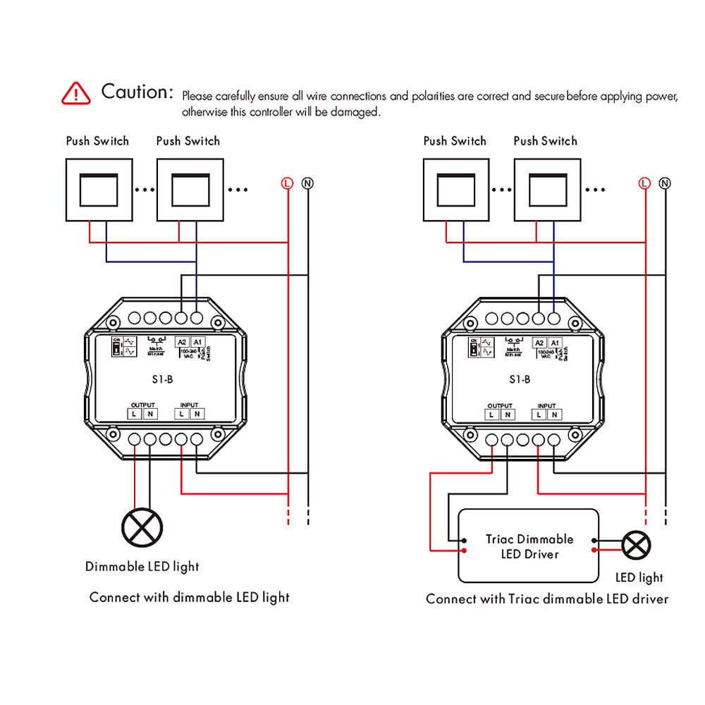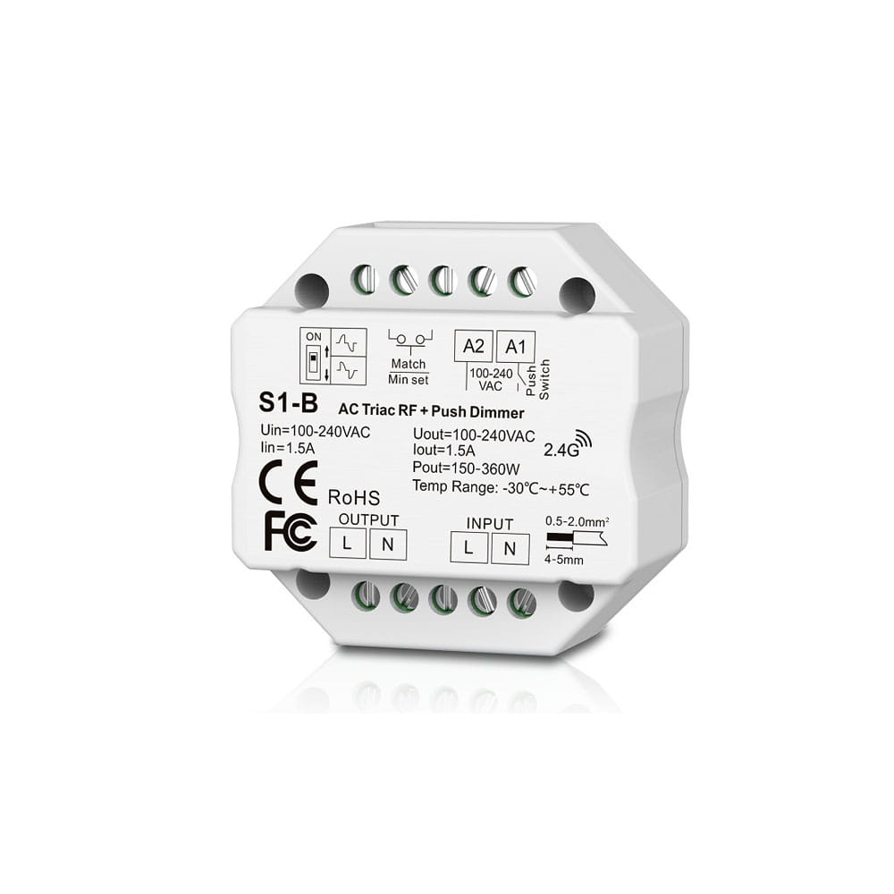 Odbiornik led został wzbogacony o dodatkowe niezależne wejście na przycisk dzwonkowy umożliwiające ściemnianie/rozjaśnianie przy użyciu przycisku zwiernego. Odbiornik S1-B wyróżnia się dwoma trybami płynnego ściemniania - Ściemnianie wykorzystujące odwróconą fazę bazującą na opadającej krawędzi prądu oraz fazę do przodu charakteryzującą się wykorzystaniem krawędzi napływu prądu, oba te tryby możemy ustalić przy pomocy niewielkiego switcha na obudowie. Ściemniacz do żarówek LED posiada również funkcje blokady natężenia światła, która po ustaleniu danej jasności nie przekracza tej wartości. Wysoka jakość wykonania natomiast zapewnia 60-cio miesięczny okres gwarancyjny.