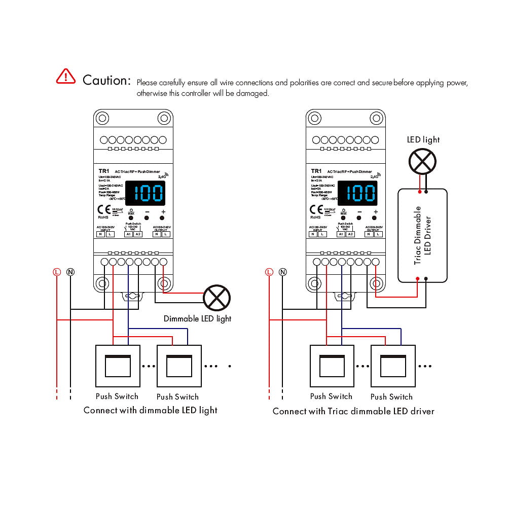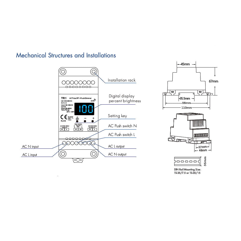 Odbiornik TR1 wyróżnia się dwoma trybami płynnego ściemniania - Ściemnianie wykorzystujące odwróconą fazę bazującą na opadającej krawędzi prądu oraz fazę do przodu charakteryzującą się wykorzystaniem krawędzi napływu prądu, oba te tryby możemy ustalić przy pomocy niewielkiego przycisku na obudowie. Ściemniacz do żarówek LED posiada również funkcje blokady natężenia światła, która po ustaleniu danej jasności nie przekracza tej wartości. Ściemniacz do żarówek led 230V został przystosowany do montażu na szynę instalacyjną DIN-TH35. Posiada również wbudowany wyświetlacz LCD ukazujący aktualny procent natężenia jasności. Wysoka jakość wykonania natomiast zapewnia 60-cio miesięczny okres gwarancyjny.