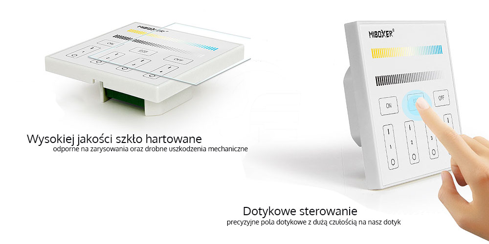 Panel LED naścienny - CCT - 4 strefowy – DMX512 – X2, to przewodowy panel naścienny umożliwiający zarządzenie jasnością oraz temperaturą barwową taśmy LED ze zmienną temperaturą barwową CCT za pomocą sygnału opartego na systemie sterowania komunikacji DMX512. Panel naścienny zasilany jest z bezpośredni z sieci 230VAC. Każda z dostępnych stref, posiada ustalone na stale adresy komunikacji dla poszczególnych kanałów WW/CW, które sa uwzględnione w instrukcji użytkownika. Montowany jest do standardowej puszki fi60.