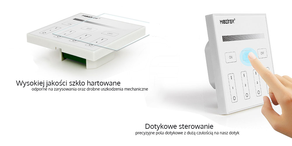 Panel LED naścienny - Mono - 4 strefowy – DMX512 – X1, to przewodowy panel naścienny umożliwiający zarządzenie jasnością dla monochromatycznej taśmy LED za pomocą sygnału opartego na systemie sterowania komunikacji DMX512. Panel naścienny zasilany jest z bezpośredni z sieci 230VAC. Każda z dostępnych stref, posiada ustalony na stale adres komunikacji, który uwzględniony jest w instrukcji użytkownika. Montowany jest do standardowej puszki fi60.