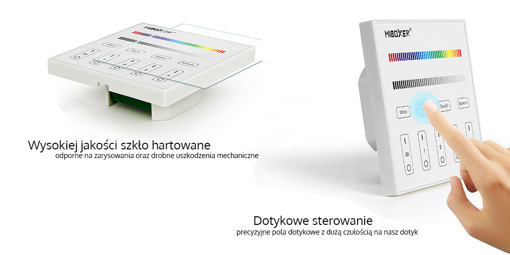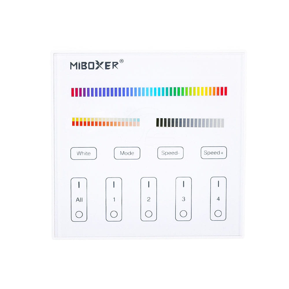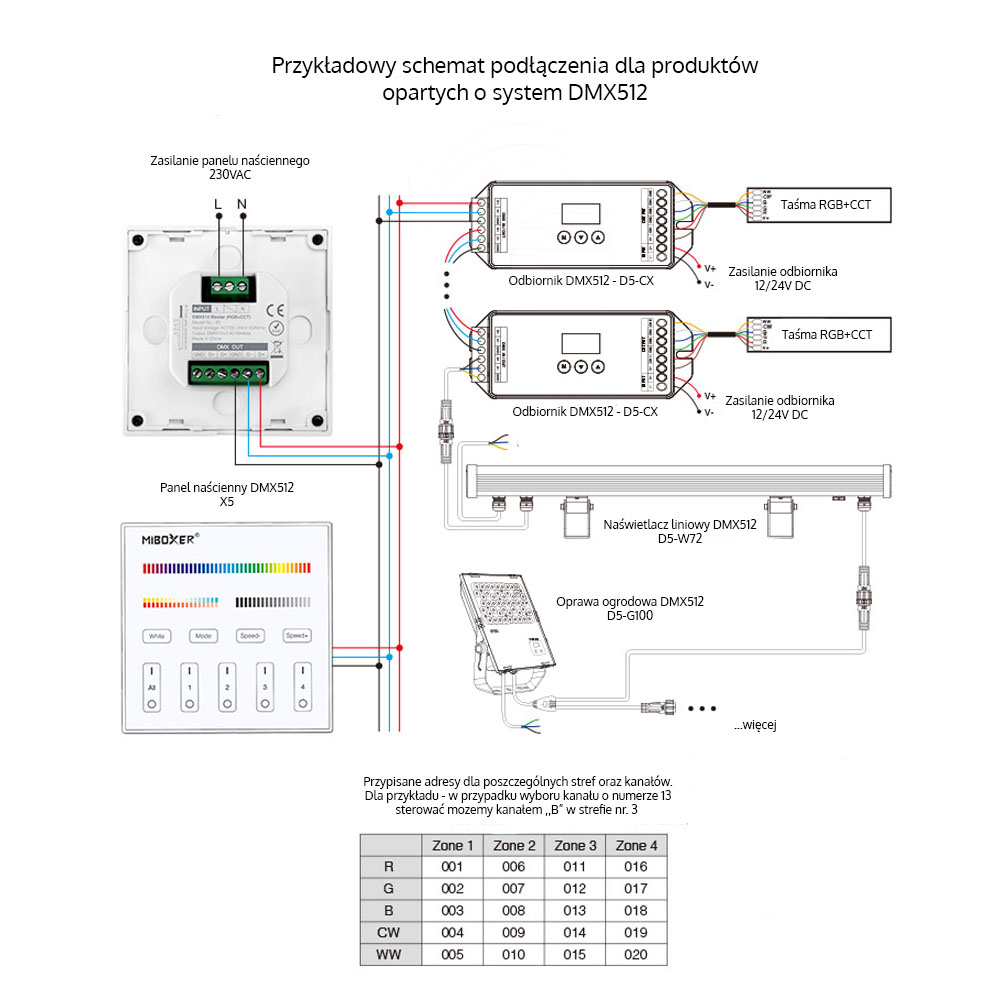 Panel LED naścienny - RGB+CCT - 4 strefowy – DMX512 – X5, to przewodowy panel naścienny umożliwiający zarządzenie jasnością oraz temperaturą barwową z możliwością wysterowania danego koloru RGB dla urządzeń przystosowanych do instalacji wielokolorowych ze zmienną temperaturą barwową RGB+CCT za pomocą sygnału opartego na systemie sterowania komunikacji DMX512. Panel naścienny zasilany jest z bezpośredni z sieci 230VAC. Każda z dostępnych stref, posiada ustalone na stale adresy komunikacji dla poszczególnych kanałów R/G/B/CW/WW, które są uwzględnione w instrukcji użytkownika. Montowany jest do standardowej puszki fi60
