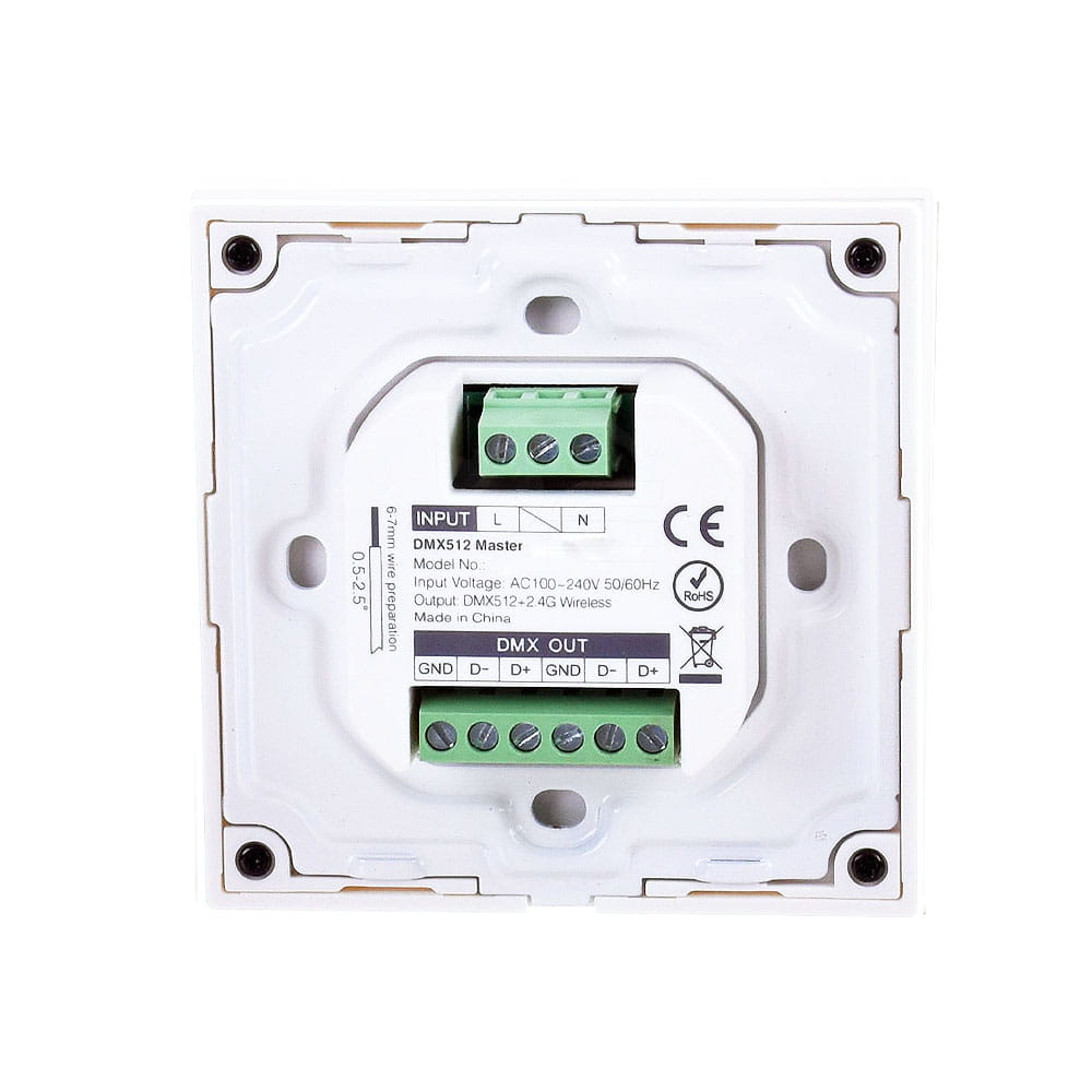 Panel LED naścienny - RGB+W - 4 strefowy – DMX512 – X4, to przewodowy panel naścienny umożliwiający zarządzenie jasnością z możliwością wysterowania danego koloru RGB dla urządzeń przystosowanych do instalacji wielokolorowych z dodatkową barwą białą za pomocą sygnału opartego na systemie sterowania komunikacji DMX512. Panel naścienny zasilany jest z bezpośredni z sieci 230VAC. Każda z dostępnych stref, posiada ustalone na stale adresy komunikacji dla poszczególnych kanałów R/G/B/W, które są uwzględnione w instrukcji użytkownika. Montowany jest do standardowej puszki fi60.