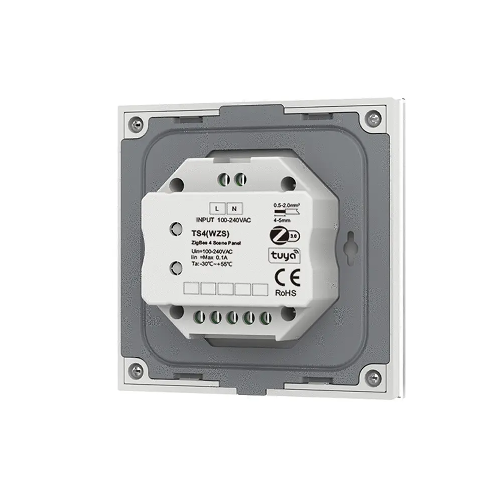 Panel LED naścienny - Zigbee 3.0 - 4 sceny - 230V - TS4(WZS)(B) - to dotykowy sterownik LED w formie bezprzewodowego panelu naściennego led, który dedykowany jest do instalacji opartych o protokół komunikacji zigbee 3.0. Panel naścienny TS4(WZS) może być wykorzystany za równo do instalacji składających się z jednokolorowej taśmy LED lub wielokolorowej z możliwością zmiany temperatury barwowej RGB+CCT (np. taśma LED RGB+CCT). Panel naścienny LED TS4(WZS) posiada cztery dotykowe przyciski funkcyjne, do których możemy przypisać różne scenariusze (np. włączenie/wyłączenie oświetlenia LED czy ustalenie konkretnego poziomu jasności bądź koloru dla taśmy LED). Komunikacja sterownika LED TS4(WZS), wykorzystuje bezprzewodową łączność z aplikacją mobilną Tuya APP/Smart APP, która mimo uzyskania dostępu do instalacji led, pozwala również na szybką konfigurację i określenie funkcji przeznaczonej dla naszych scen. Do zestawu dołączone są naklejki w języku angielskim, które można nakleić na pole dotykowe