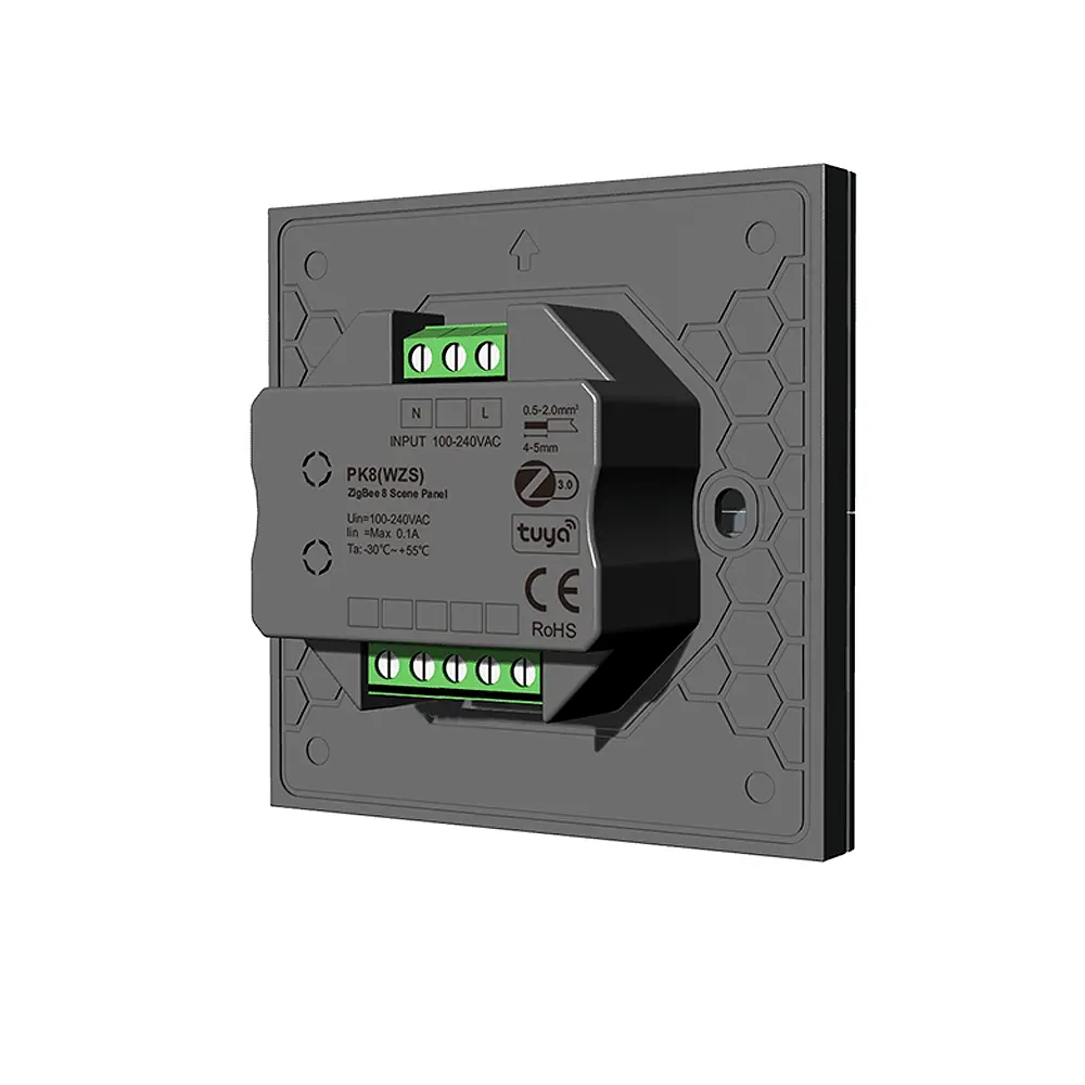 Panel LED naścienny - Zigbee 3.0 - 8 scen- 230V - PK8(WZS) - to sterownik LED w formie bezprzewodowego panelu naściennego led, który dedykowany jest do instalacji opartych o protokół komunikacji zigbee 3.0. Panel naścienny PK8(WZS) może być wykorzystany za równo do instalacji składających się z jednokolorowej taśmy LED lub wielokolorowej z możliwością zmiany temperatury barwowej RGB+CCT (np. taśma LED RGB+CCT). Panel naścienny LED PK8(WZS) posiada osiem mechanicznych przycisków funkcyjnych, do których możemy przypisać różne scenariusze (np. włączenie/wyłączenie oświetlenia LED czy ustalenie konkretnego poziomu jasności bądź koloru dla taśmy LED). Komunikacja sterownika LED PK8(WZS), wykorzystuje bezprzewodową łączność z aplikacją mobilną Tuya APP/Smart APP, która mimo uzyskania dostępu do instalacji led, pozwala również na szybką konfigurację i określenie funkcji przeznaczonej dla naszych scen. Do zestawu dołączone są naklejki w języku angielskim, które można nakleić na przyciski sterujące
