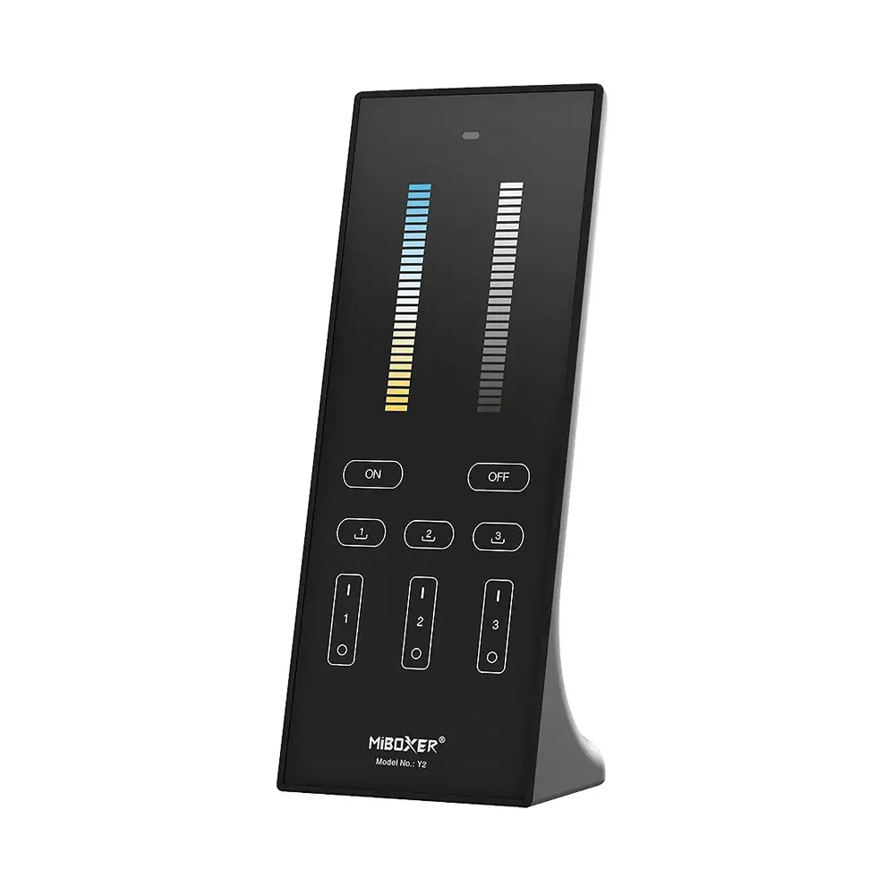 Panel LED z podstawką - CCT - 3 strefowy - 2x1,5V - Y2 - to sterownik LED w formie bezprzewodowego panelu led z podstawką, który dedykowany jest dla instalacji LED składających się z oświetlenia LED ze zmienną temperaturą barwową CCT (np. taśma LED CCT). Panel LED z podstawką Y2 umożliwia pełną kontrolę w postaci załączania oraz wyłączania wraz z uzyskaniem dostępu do ściemniania oświetleniem LED oraz regulacji temperatury barwowej w zakresie 2700-6500K przy pomocy dotykowych suwaków. Panel z podstawką pozwala na kontrole trzech dostępnych stref przy użyciu bezprzewodowej drogi radiowej opartej o częstotliwość rzędu 2,4GHz, charakteryzującej się zasięgiem komunikacji na poziomie 30 metrów w terenie otwartym. Współpracuję ze sterownikami z serii Mi-Boxer.