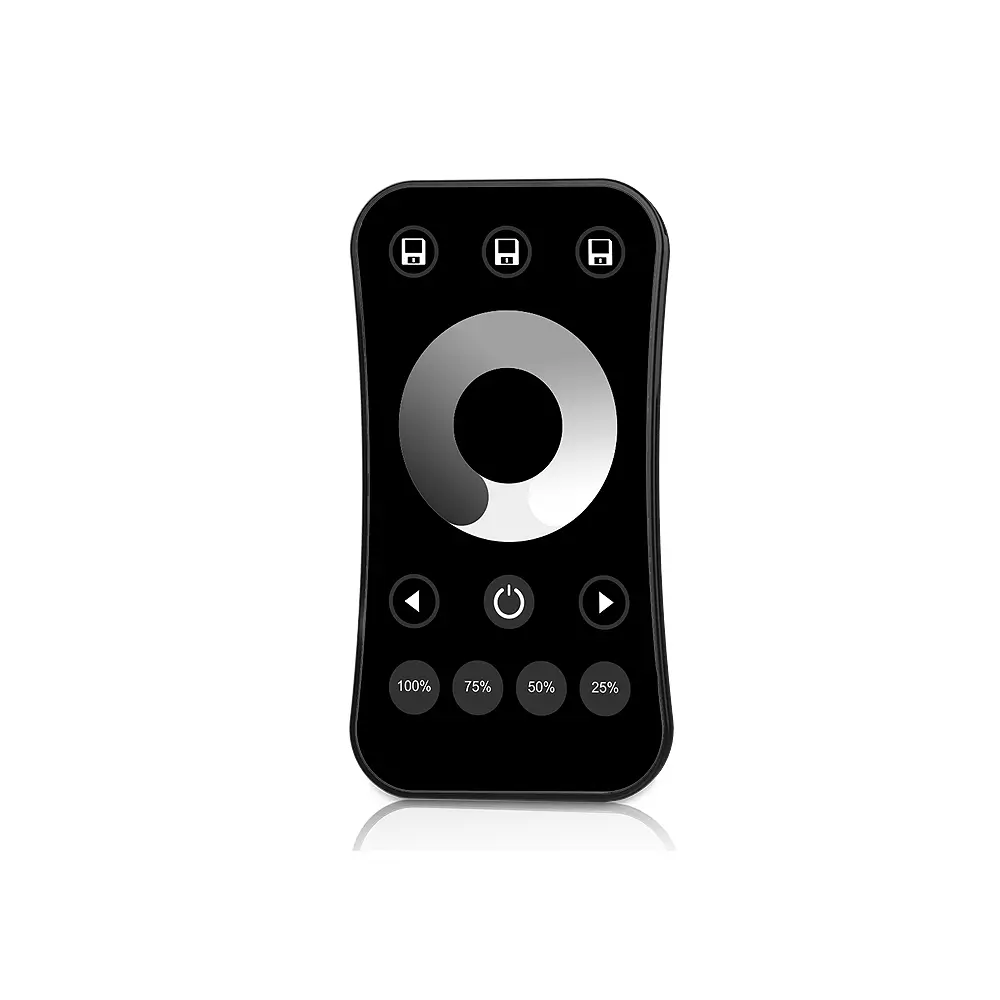 Pilot radiowy do LED R6-1(B) cechuje się również unikalnością z uwagi na szereg rozmaitych funkcji jak - tryb zapisu umożliwiający zapisanie ustalonych sekwencji natężenia jasności oraz szybki dostęp do określonej jasności (100/75/50/25%) Sam dostęp do ściemniania instalacją LED możliwy jest przy klasycznych przycisków mechanicznych oraz dotykowej tarczy. Zasilany jest baterią CR2032. Posiada w zestawie uchwyt naścienny, który możemy zastosować na ścianie bądź innej stabilnej powierzchni.