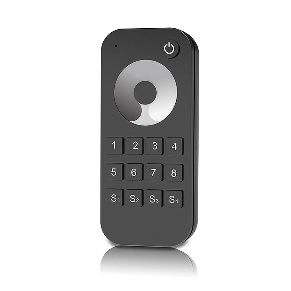 Pilot radiowy do LED RT8 cechuje się również unikalnością z uwagi na szereg rozmaitych funkcji jak możliwość zapisu i odtworzenia określonego poziomu z zakresu 1-100% czy indywidualny dostęp do jeden z ośmiu stref. Sam dostęp do ściemniania instalacją LED możliwy jest przy użyciu czułej dotykowej tarczy bądź mechanicznych przycisków do których przypisana jest określona funkcja. Zasilany jest dwoma bateriami AAA.