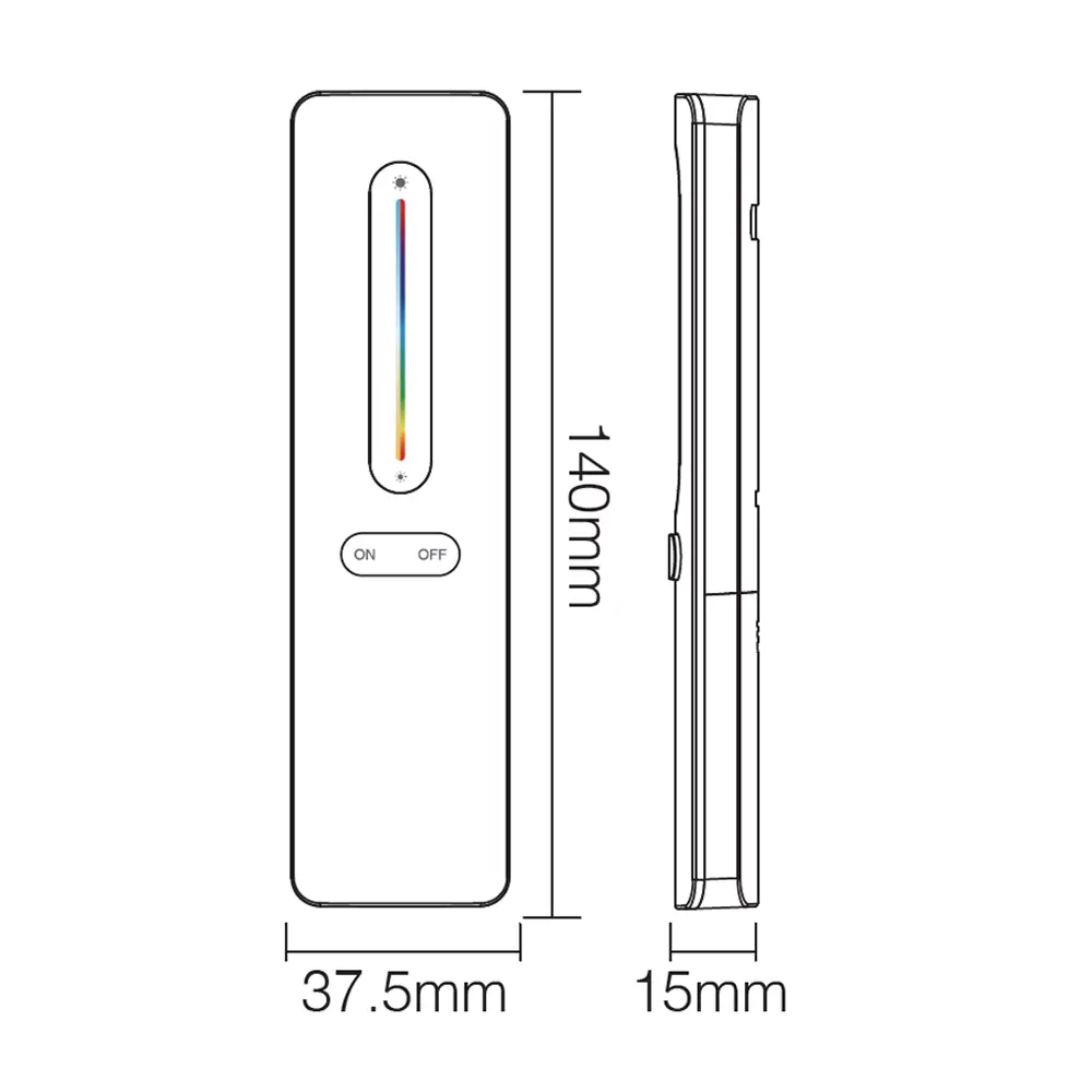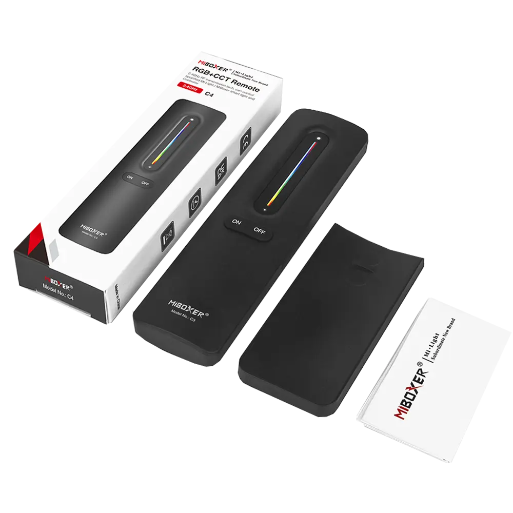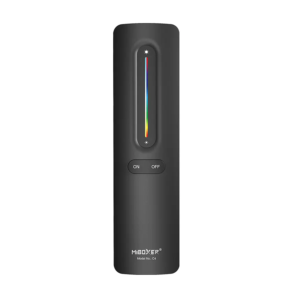 Pilot LED - RGB / RGB+W / RGB+CCT - 1 strefowy - C4 , to nowocześnie wykonany pilot radiowy led dedykowany do odbiorników radiowych miBoxer. Pilot LED C4, pozwala na indywidualne sterowanie jedną strefą. Wielofunkcyjny pilot radiowy miBoxer C4 umożliwia zmianę natężenia jasności dla taśmy LED jednokolorowej wraz ze zmianą temperatury barwowej CCT w zakresie 2700-6500K dla taśm LED CCT oraz wysterowanie dowolnego koloru RGB dla wielokolorowych taśm LED za pomocą dotykowego suwaka znajdującego się na smukłej obudowie pilota LED. Pilot w swojej budowie posiada silny magnetyczny uchwyt. Zasilany jest dwoma bateriami AAA.