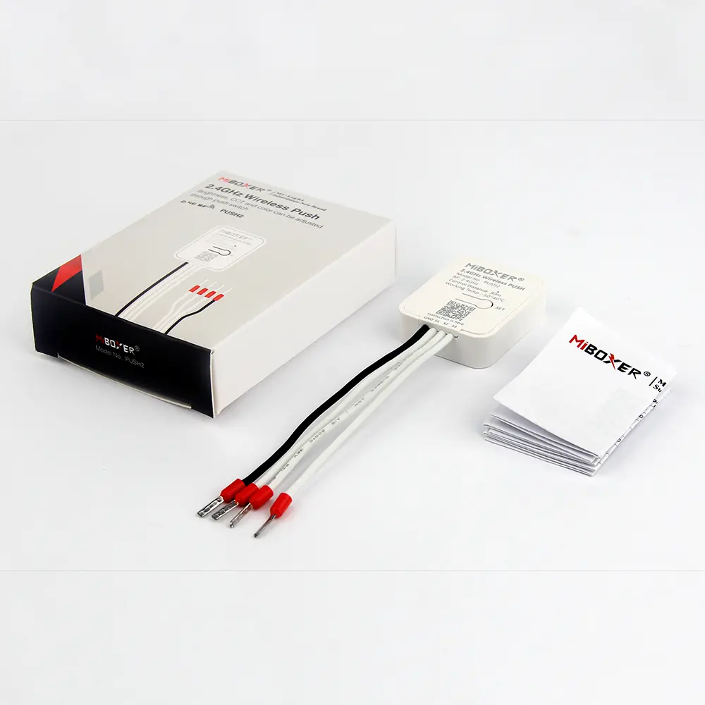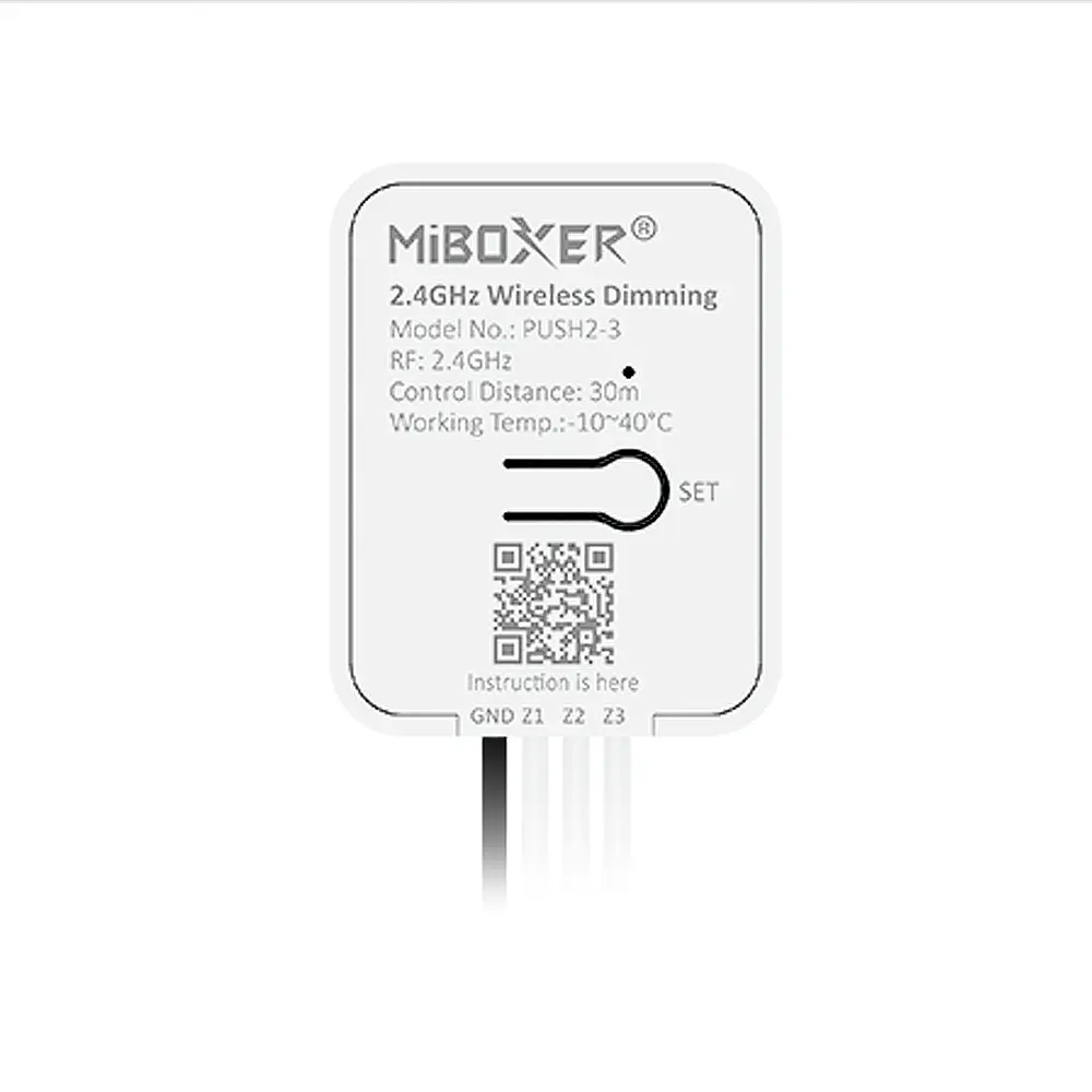 Pilot do puszkowy LED PUSH2-3 z serii Mi-Boxer, to nadajnik umożliwiający sterowanie instalacją LED składającą się maksymalnie z trzech stref jednokolorowego oświetlenia LED (np. taśmy LED MONO) przy wykorzystaniu odbiorników radiowych miBoxer. Ściemniacz do puszkowy LED PUSH2-3 posiada trzy wyjścia bezpotencjałowe, które możemy podłączyć do trzy klawiszowego przycisku dzwonkowego, aby mieć możliwość regulacji natężenia jasności dla maksymalnie trzech stref oświetlenia LED. Sygnał otrzymany z przycisku dzwonkowego jest przekazywany przewodowo do ściemniacza PUSH2-3, który przekazuje go bezprzewodowo do odbiornika radiowego — wykorzystując drogę radiową o częstotliwości 2,4GHz. Zasięg takiej komunikacji wynosi 30 metrów z możliwością przedłużenia tego sygnału poprzez stosowanie dodatkowego odbiornika. Montowany jest bezpośrednio w puszce fi60 wraz z przyciskiem dzwonkowym a zasilany jest bezprzewodowo z wykorzystaniem baterii 3V CR2032.
