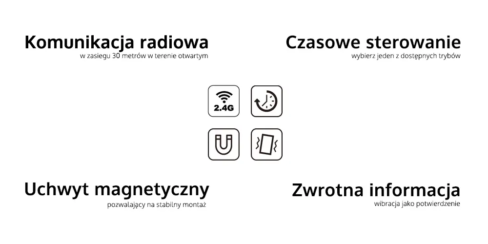 Pilot radiowy do włączników miBoxer, charakteryzuje się zdalną komunikacją radiową opartą na częstotliwości 2,4Ghz. Istotną funkcją dla tego włącznika do oświetlenia LED jest tryb czasowego wyłączenia oświetlenia, które realizowane jest poprzez przycisk dostępny na obudowie pilota. Co ważniejsze, urządzenie zwrotnie nas informuje o powiadomieniu poprzez wywołanie wibracji na pilocie. Pilot do oświetlenia możemy stabilnie zamocować na uchwycie magnetycznym.