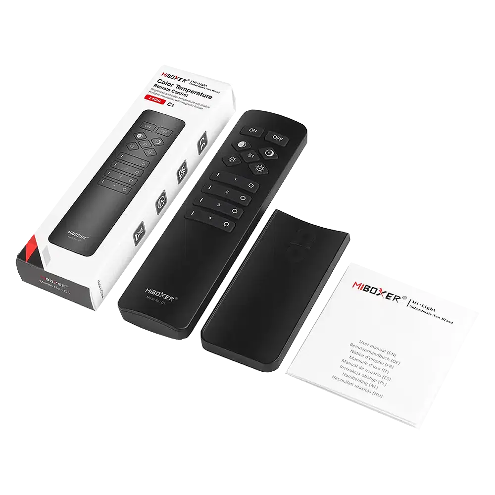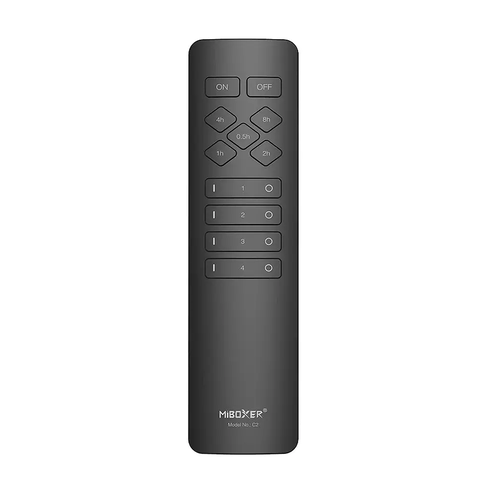 Pilot LED - do włączników oświetlenia miBoxer - 4 strefowy - C2, to nietuzinkowo wykonany pilot radiowy dedykowany do wyłączników radiowych miBoxer. Pilot LED C2, pozwala na indywidualne sterowanie każdą z czterech stref. Wielofunkcyjny pilot radiowy miBoxer C2, umożliwia załączenie oraz wyłączenie danego obwodu elektrycznego 230V za pomocą przycisków znajdujących się na smukłej obudowie. Urządzenie posiada również kilka przycisków, które odpowiadają za czasowy dostęp do instalacji złożonej z wyłączników 230V - od 30 min do 8h. Pilot mocowany jest na silnym uchwycie magnetycznym. Zasilany jest dwoma bateriami AAA.