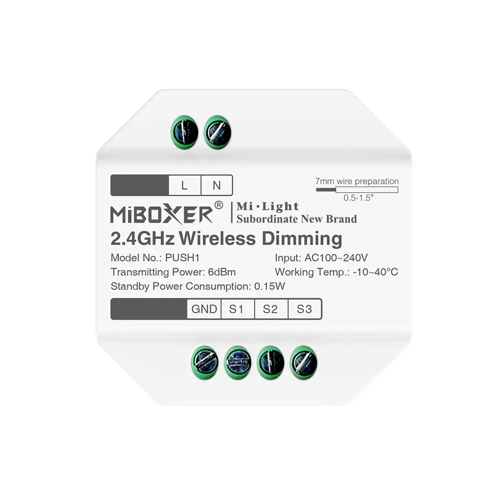Pilot do puszkowy LED PUSH1 z serii Mi-Boxer, to nadajnik umożliwiający sterowanie oświetleniem LED dedykowanym dla jednej strefy przy wykorzystaniu odbiornika radiowego miBoxer. Sterownik do puszkowy LED PUSH1 posiada trzy wyjścia bezpotencjałowe, które możemy podłączyć do trzy klawiszowego przycisku dzwonkowego, aby móc uzyskać możliwość sterowania oświetleniem LED składającym się z wielokolorowej taśmy LED wraz ze zmienną temperaturą barwową RGB+CCT. Każdy z tych przycisków realizuje inną funkcję sterowania. Pilot LED do przycisków dzwonkowych PUSH1 charakteryzuje się pełną możliwością sterowania — uzyskaniem zarówno dowolnego koloru z palety barw RGB, jak również czynną zmianą natężenia jasności wraz ze zmianą temperatury barwowej CCT w zakresie 2700-6500K, a sam sygnał otrzymywany z przycisku dzwonkowego podłączonego do sterownika PUSH1 przesyłany jest drogą radiową do odbiornika miBoxer w obrębie 30 metrów w terenie otwartym. Montowany jest bezpośrednio w puszce fi60 wraz z przyciskiem dzwonkowym a zasilany jest bezpośrednio z sieci 230VAC.