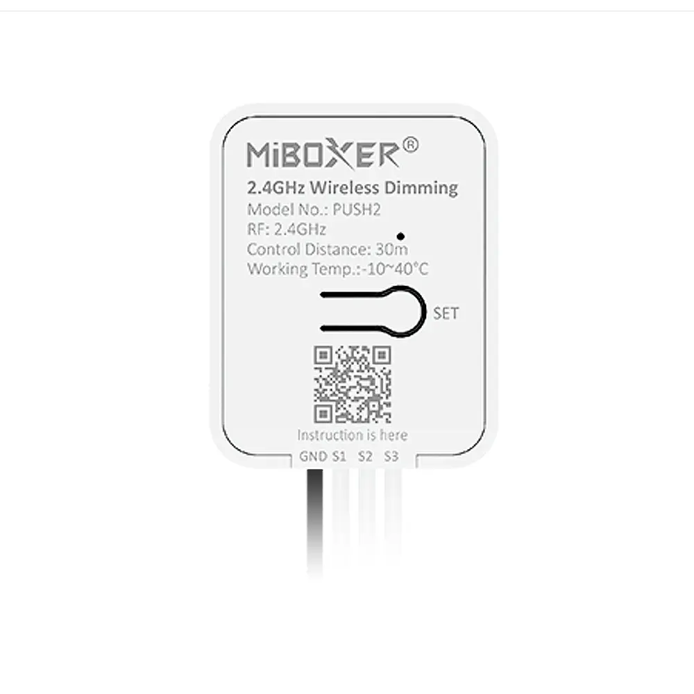 Pilot do puszkowy LED PUSH2 z serii Mi-Boxer, to nadajnik umożliwiający sterowanie oświetleniem LED dedykowanym dla jednej strefy przy wykorzystaniu odbiornika radiowego miBoxer. Sterownik do puszkowy LED PUSH2 posiada trzy wyjścia bezpotencjałowe, które możemy podłączyć do trzy klawiszowego przycisku dzwonkowego, aby móc uzyskać możliwość sterowania oświetleniem LED składającym się z wielokolorowej taśmy LED wraz ze zmienną temperaturą barwową RGB+CCT. Każdy z tych przycisków realizuje inną funkcję sterowania. Pilot LED do przycisków dzwonkowych PUSH2 charakteryzuje się pełną możliwością sterowania — uzyskaniem zarówno dowolnego koloru z palety barw RGB, jak również czynną zmianą natężenia jasności wraz ze zmianą temperatury barwowej CCT w zakresie 2700-6500K, a sam sygnał otrzymywany z przycisku dzwonkowego podłączonego do sterownika PUSH2 przesyłany jest drogą radiową do odbiornika miBoxer w obrębie 30 metrów w terenie otwartym. Montowany jest bezpośrednio w puszce fi60 wraz z przyciskiem dzwonkowym a zasilany jest bezprzewodowo z użyciem baterii 3V CR2032.