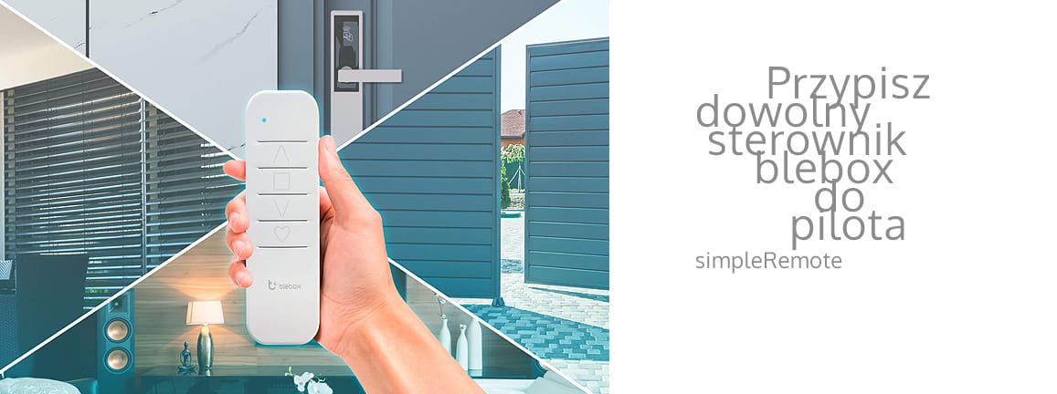 Pilot do sterowania simpleRemote, to proste urządzenie pozwalające na zewnętrzny dostęp do sterowników polskiej marki Blebox, przy pomocy niewielkiego poręcznego pilota. Umożliwia on sterowanie różnymi sterownikami współpracującymi z mobilną aplikacją wBox (np. shutterBox, gateBox, switchBox). Pilot w swojej budowie posiada cztery przyciski, które mogą zostać przypisane do sterowania czterema niezależnymi urządzeniami oraz być dowolnie modyfikowane pod kątem swojej funkcjonalności, zapewniając tym samym szybką i wygodną kontrolę nad instalacją złożoną ze sterowników Blebox. Pilot sRemote zasilany jest dwoma paluszkami AAA, a jego niewielki pobór prądu, pozwala na długie użytkowania pilota bez konieczności częstej wymiany.