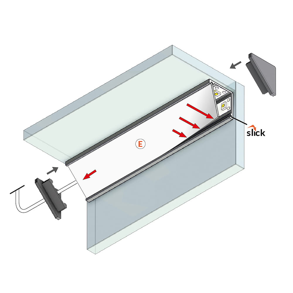 - Klosz E "Mleczny" - (transparentność 60%) - klosz wsuwany do profilu. Wersja mleczna klosza tworzy efekt jednolitej poświaty (w głębszych profilach jednolitej linii) a także niweluje efekt olśnienia.