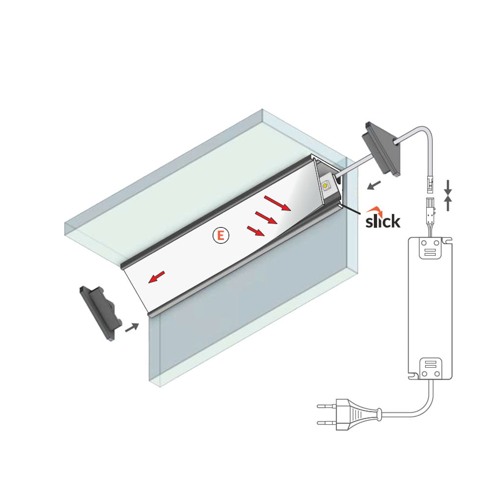 Zaletą profilu LED CABI12 jest jego wyposażenie, mianowicie posiada on gniazdo "slick", które to pozwala na łatwe "wklikiwanie" klosza. Takie rozwiązanie z pewnością sprawdzi się idealnie w miejscach, w których powierzchnia montażowa jest ograniczona a co za tym idzie - wsunięcie całęgo klosza od boku jest problematyczne.
