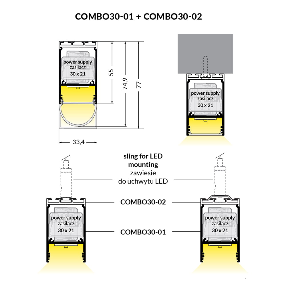 Schemat montażowy profilu LED COMBO30-01 z opcjonalnymi akcesoriami