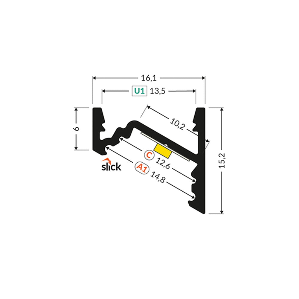 - Klosz C "Czarny" - (transparentność 40%) - klosz zatrzaskowy, wciskany do profilu. Czarna wersja klosza doskonale komponuje się z czarnymi profilami LED tworząc jednolitą czarną powierzchnię razem z profilem. Mimo, że jest to klosz czarny - nie zmienia on barwy światła zainstalowanego w profilu.
