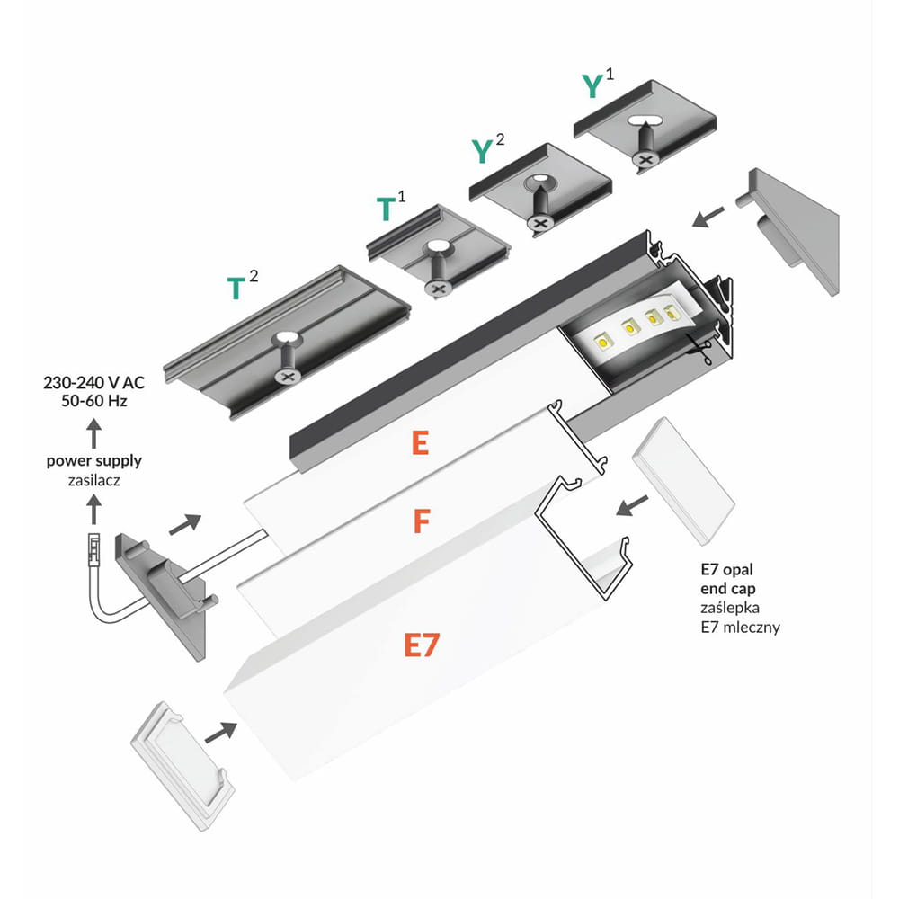 - Klosz E7 "Mleczny" - (transparentność 70%) - klosz zatrzaskowy, wciskany do profilu. Wersja mleczna klosza tworzy efekt jednolitej poświaty (w głębszych profilach jednolitej linii) a także niweluje efekt olśnienia. Atutem klosza jest jego budowa w kształcie "tuby" - pozwalająca zwiększyć możliwości użytkowe profilu i wykorzystać go m.in. jako nowoczesną - minimalistyczną lampę.