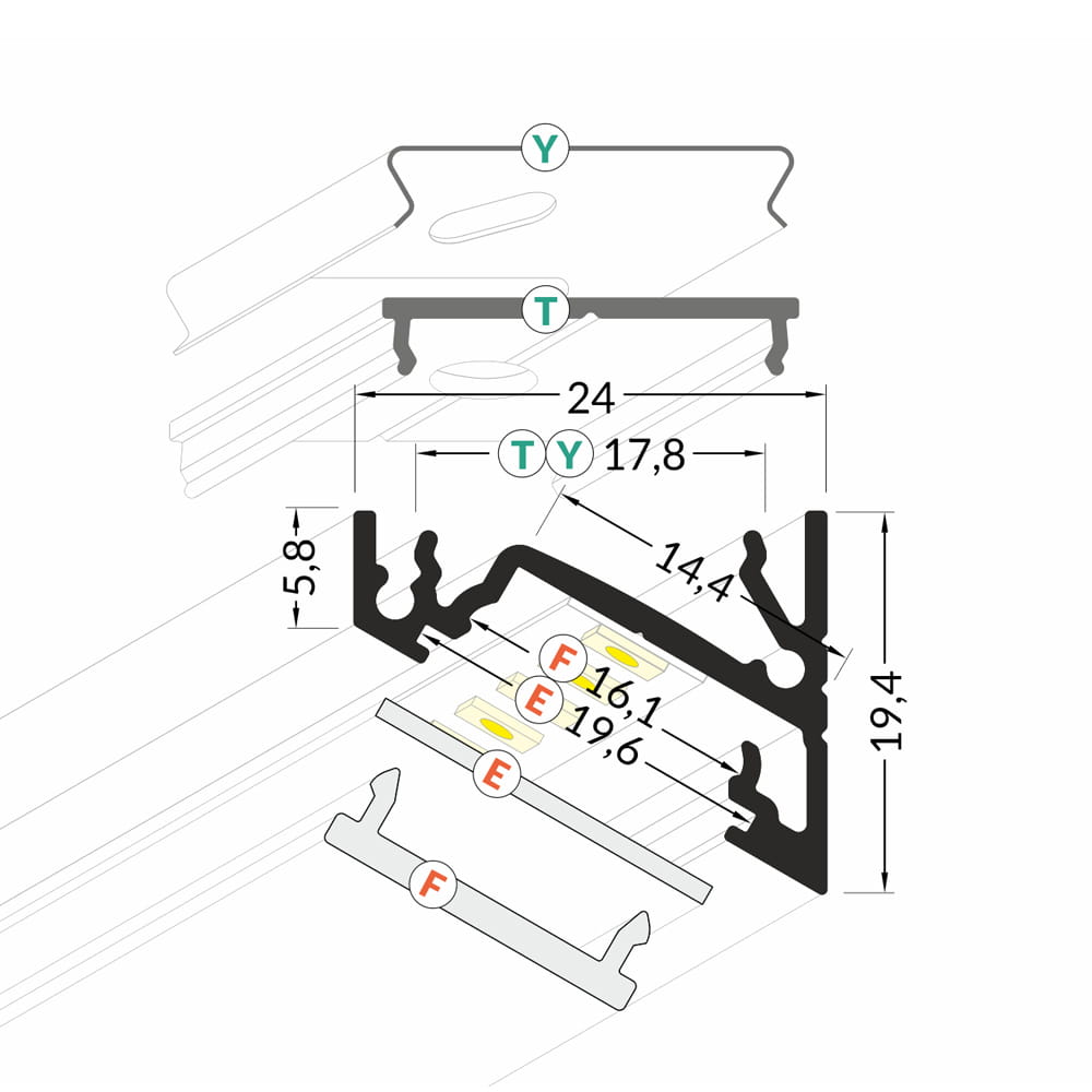 - Klosz F "Czarny" - (transparentność 40%) - klosz zatrzaskowy, wciskany do profilu. Czarna wersja klosza doskonale komponuje się z czarnymi profilami LED tworząc jednolitą czarną powierzchnię razem z profilem. Mimo, że jest to klosz czarny - nie zmienia on barwy światła zainstalowanego w profilu.