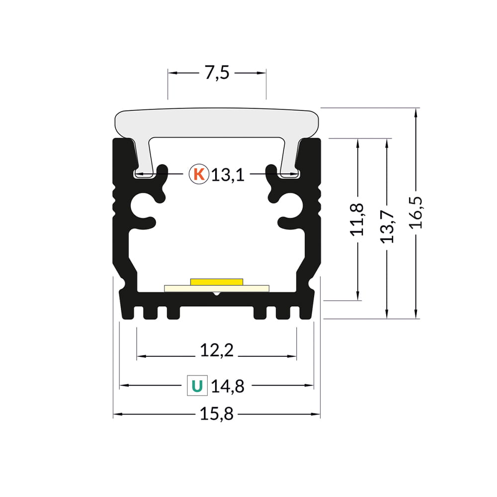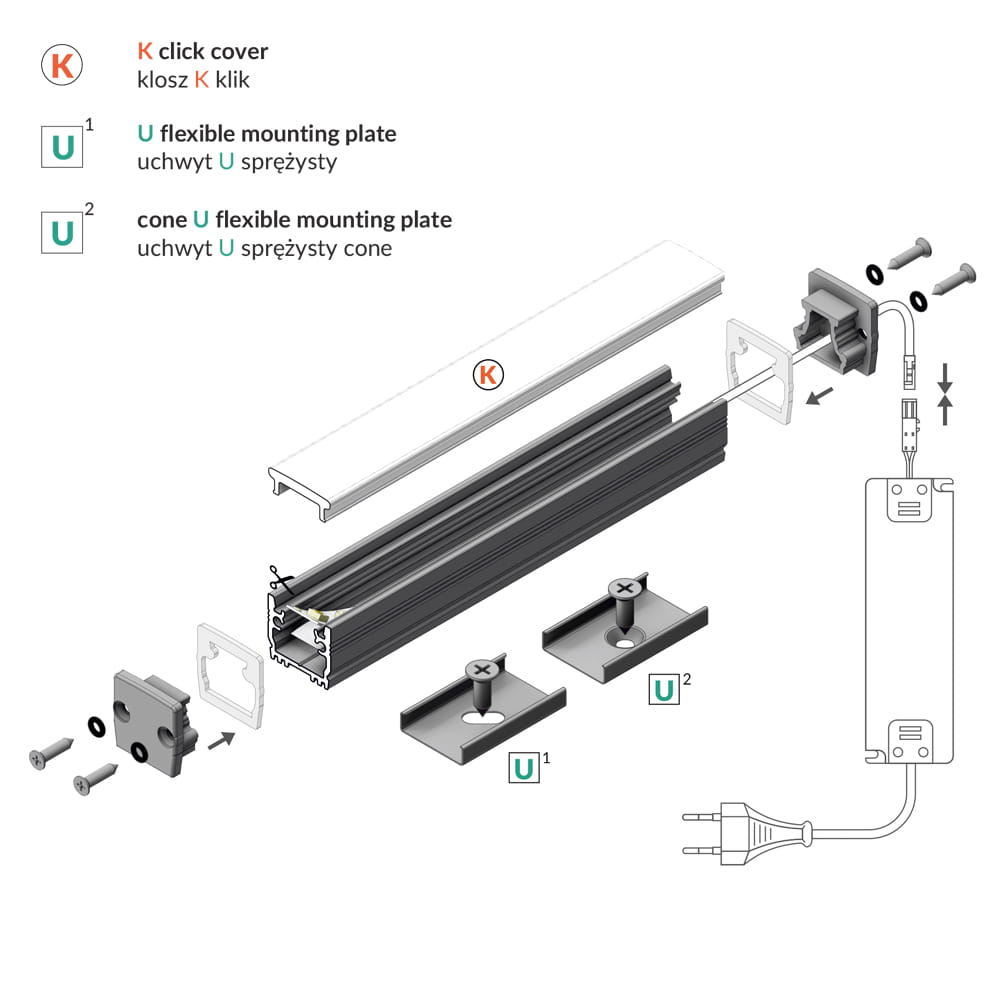 - Klosz K "Mleczny" - (transparentność 50%) - klosz zatrzaskowy, "wklikiwany" do profilu. Wersja mleczna klosza tworzy efekt jednolitej poświaty (w głębszych profilach jednolitej linii) a także niweluje efekt olśnienia. Dodatkową cechą tego klosza jest zwiększona odporność na ścieranie oraz wytrzymałość mechaniczna IK08.