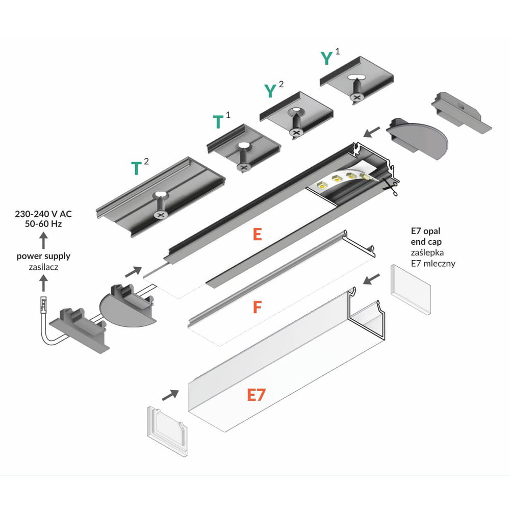 - Klosz E7 "Mleczny" - (transparentność 70%) - klosz zatrzaskowy, wciskany do profilu. Wersja mleczna klosza tworzy efekt jednolitej poświaty (w głębszych profilach jednolitej linii) a także niweluje efekt olśnienia. Atutem klosza jest jego budowa w kształcie "tuby" - pozwalająca zwiększyć możliwości użytkowe profilu i wykorzystać go m.in. jako nowoczesną - minimalistyczną lampę.
