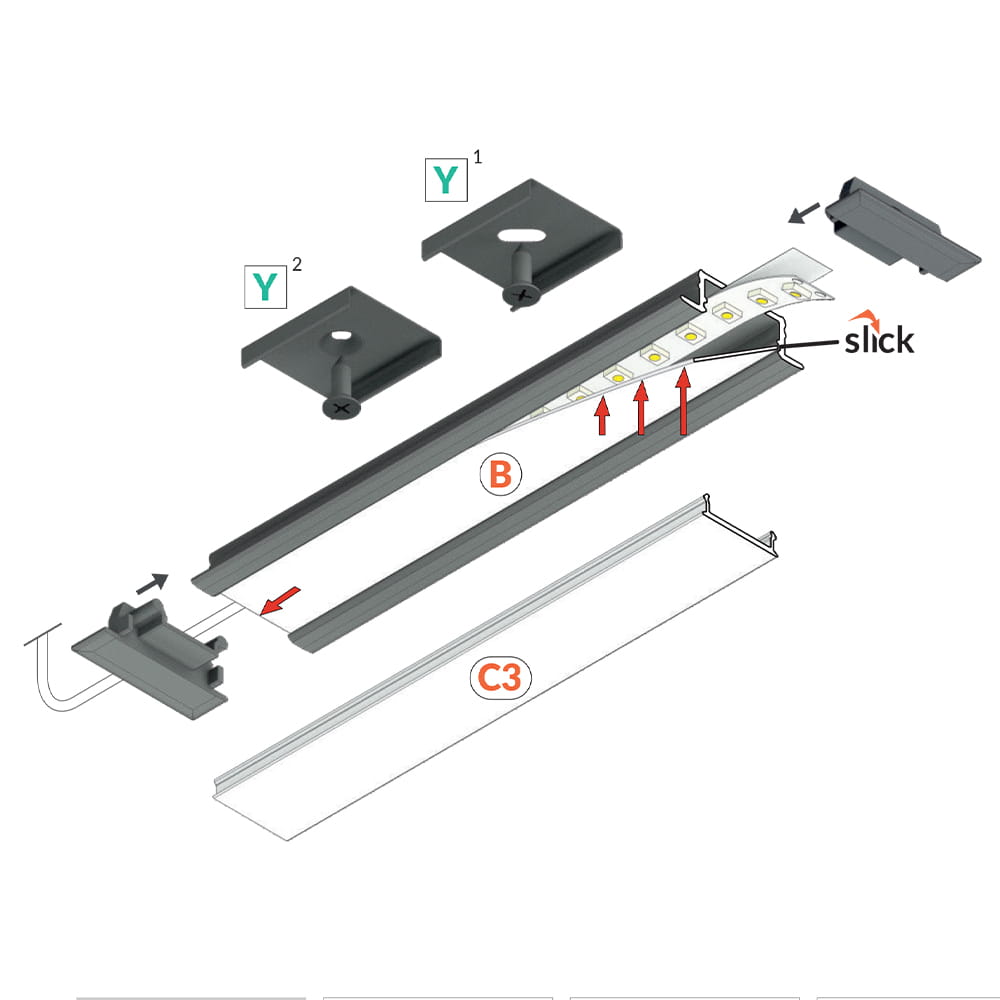 - Klosz C3 "Czarny" - (transparentność 40%) - klosz zatrzaskowy, wciskany do profilu. Czarna wersja klosza doskonale komponuje się z czarnymi profilami LED tworząc jednolitą czarną powierzchnię razem z profilem. Mimo, że jest to klosz czarny - nie zmienia on barwy światła zainstalowanego w profilu.