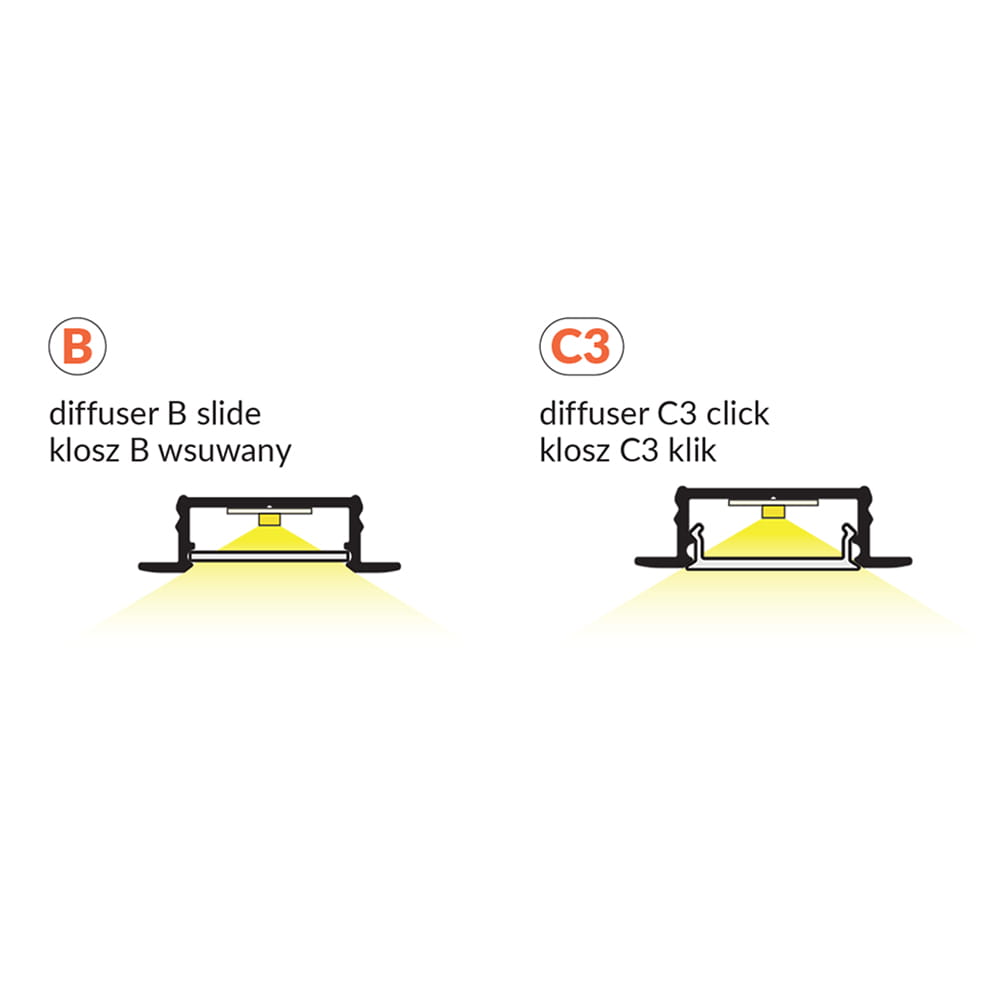 - Klosz C3 "Mleczny" - (transparentność 70%) - klosz zatrzaskowy, wciskany do profilu. Wersja mleczna klosza tworzy efekt jednolitej poświaty (w głębszych profilach jednolitej linii) a także niweluje efekt olśnienia.