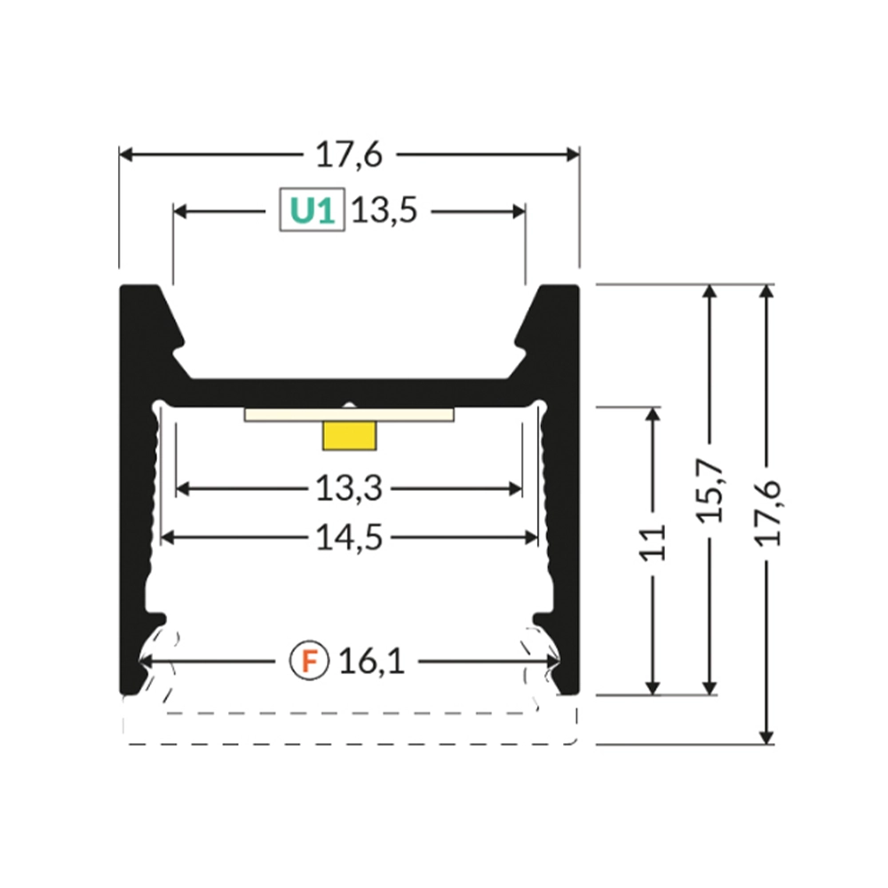 - Klosz F "Czarny" - (transparentność 40%) - klosz zatrzaskowy, wciskany do profilu. Czarna wersja klosza doskonale komponuje się z czarnymi profilami LED tworząc jednolitą czarną powierzchnię razem z profilem. Mimo, że jest to klosz czarny - nie zmienia on barwy światła zainstalowanego w profilu.