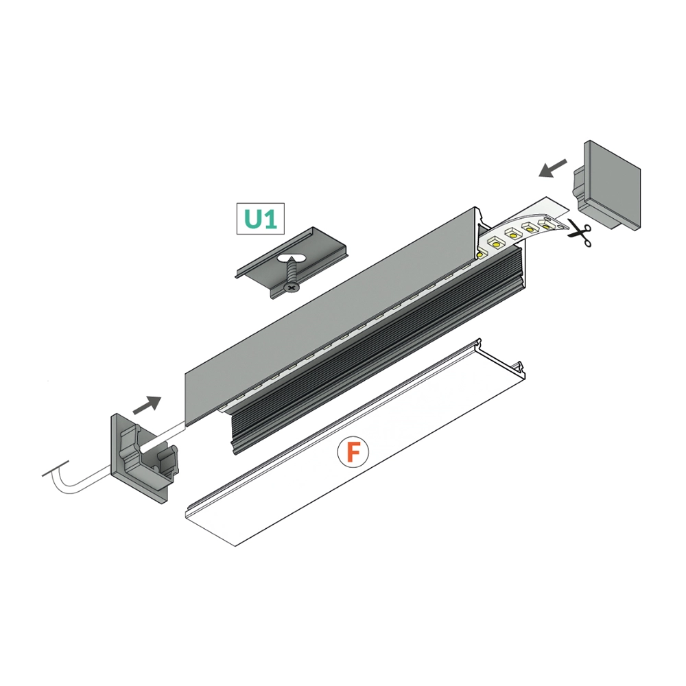 - Klosz F "Czarny" - (transparentność 40%) - klosz zatrzaskowy, wciskany do profilu. Czarna wersja klosza doskonale komponuje się z czarnymi profilami LED tworząc jednolitą czarną powierzchnię razem z profilem. Mimo, że jest to klosz czarny - nie zmienia on barwy światła zainstalowanego w profilu.