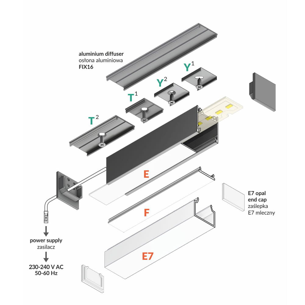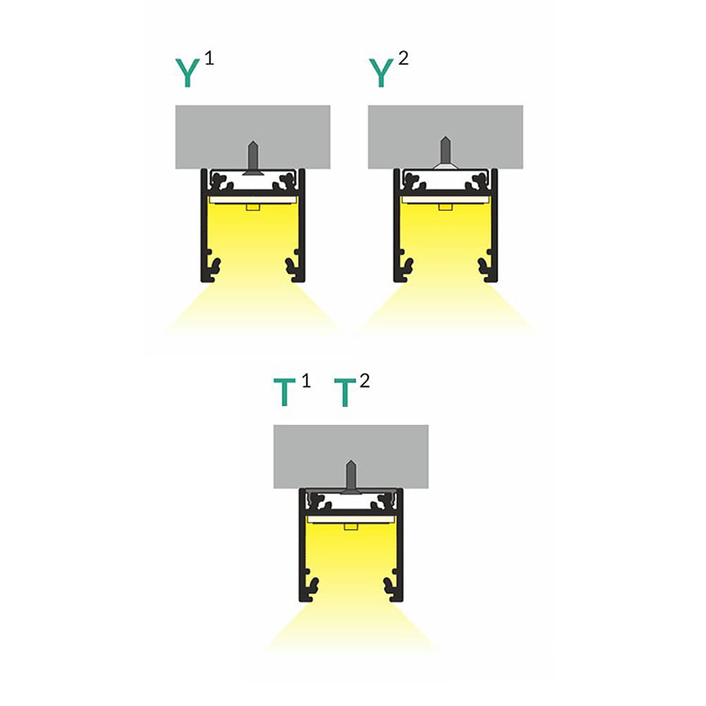 - Klosz F "Mleczny" - (transparentność 70%) - klosz zatrzaskowy, wciskany do profilu. Wersja mleczna klosza tworzy efekt jednolitej poświaty (w głębszych profilach jednolitej linii) a także niweluje efekt olśnienia.