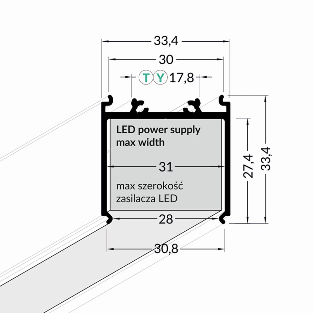 Profil aluminiowy LED VARIO30-08 to osłona zasilacza wykonana z anodowanego aluminium, która może zostać wykorzystana przy tworzeniu wielu instalacji świetlnych. Obudowa do zasilacza VARIO30-08 jest kompatybilna z każdym z profili nawierzchniowych w zestawieniu VARIO30 (patrz produkty powiązane). Profil aluminiowy VARIO30-08 doskonale sprawdzi się zarówno wykorzystany przy montażu nawierzchniowym np. w zabudowie meblowej, wiszącym jako lampa czy też jako dwustronna świetlna konstrukcja. Produkt przeznaczony dla zasilaczy o maksymalnej szerokości do 31mm. Przystosowany do montażu nawierzchniowego podwieszanego za pomocą zawiesi. Pełni funkcję zabezpieczenia i ukrycia przewodów oraz zasilaczy znajdujących się w środku listwy aluminiowej. Co ważne dla profilu aluminiowego VARIO30-08 zostały stworzone zaślepki odpowiadające każdemu rozwiązaniu w połączeniu z innym profilem VARIO30.