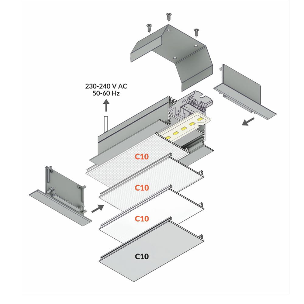 Schemat montażowy profilu LED PHIL WPUST z opcjonalnymi akcesoriami