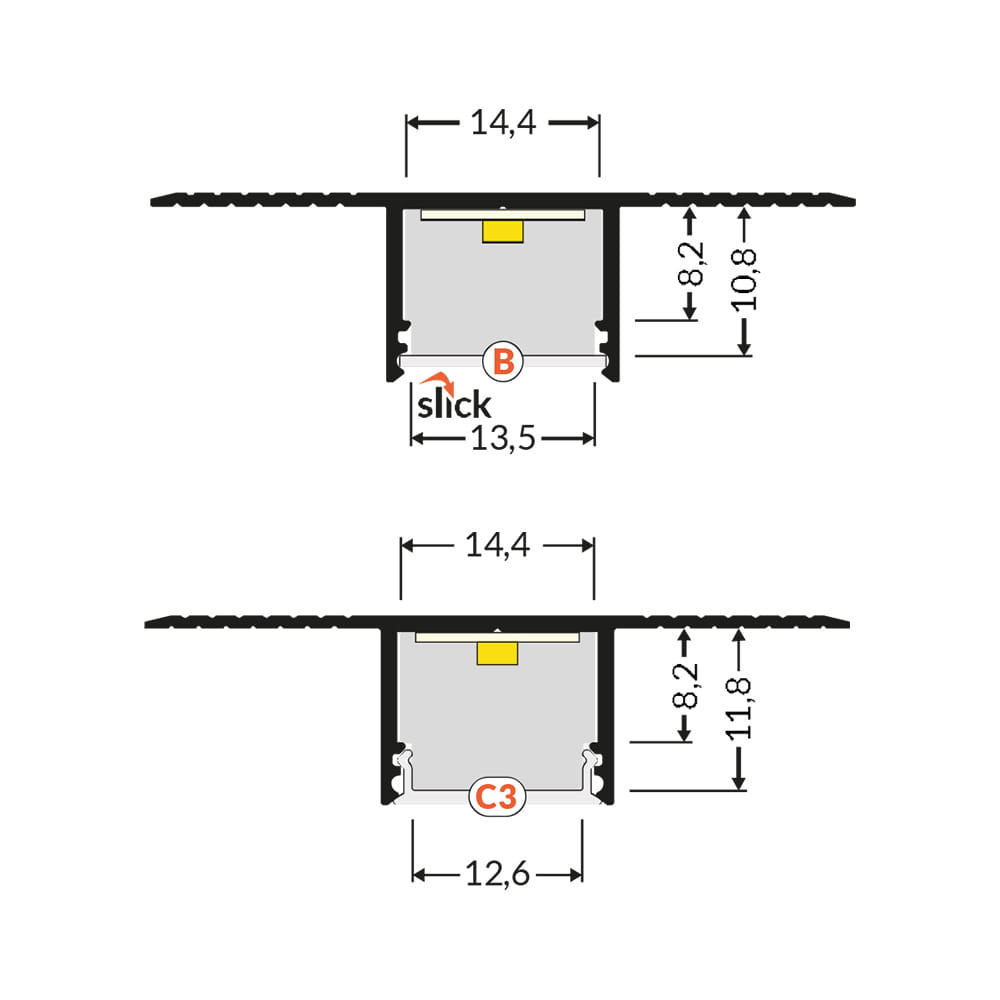 - Klosz C3 "Mleczny" - (transparentność 70%) - klosz zatrzaskowy, wciskany do profilu. Wersja mleczna klosza tworzy efekt jednolitej poświaty (w głębszych profilach jednolitej linii) a także niweluje efekt olśnienia.
