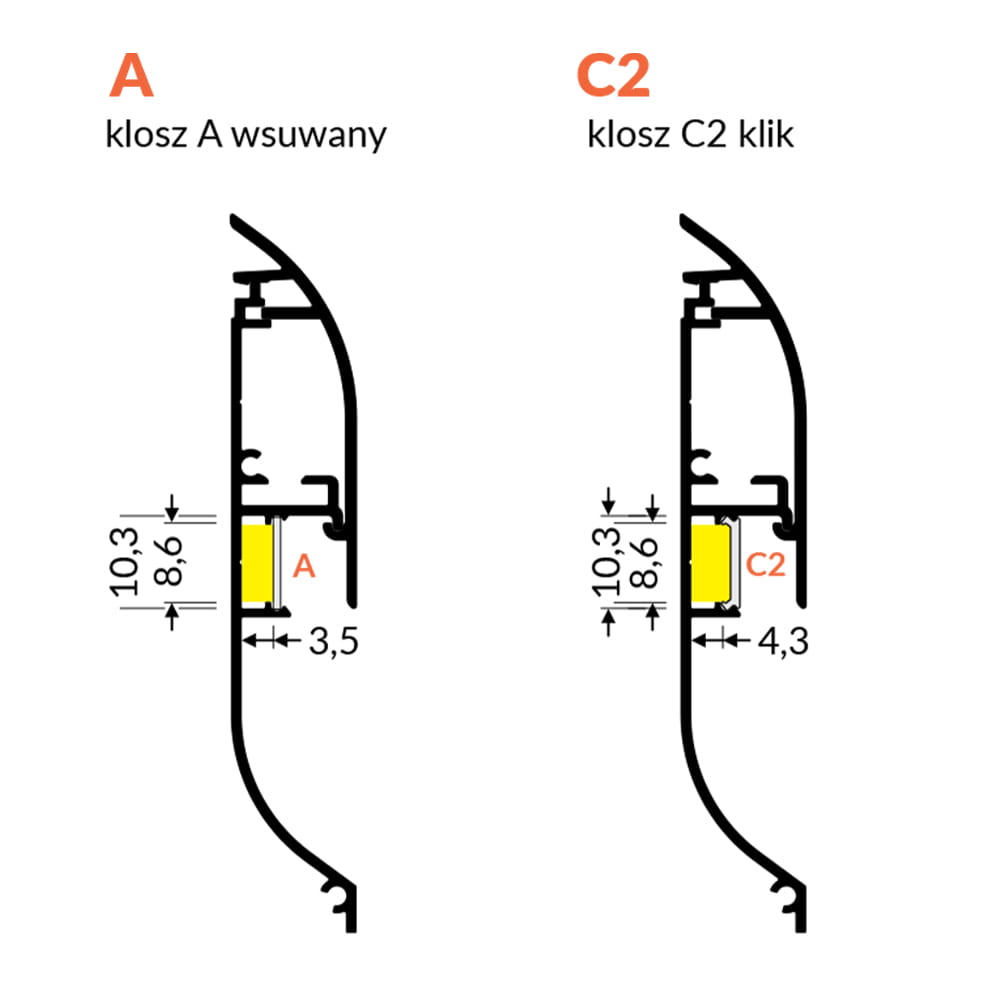 - Klosz C2 "Mleczny" - (transparentność 70%) - klosz zatrzaskowy, wciskany do profilu. Wersja mleczna klosza tworzy efekt jednolitej poświaty (w głębszych profilach jednolitej linii) a także niweluje efekt olśnienia.