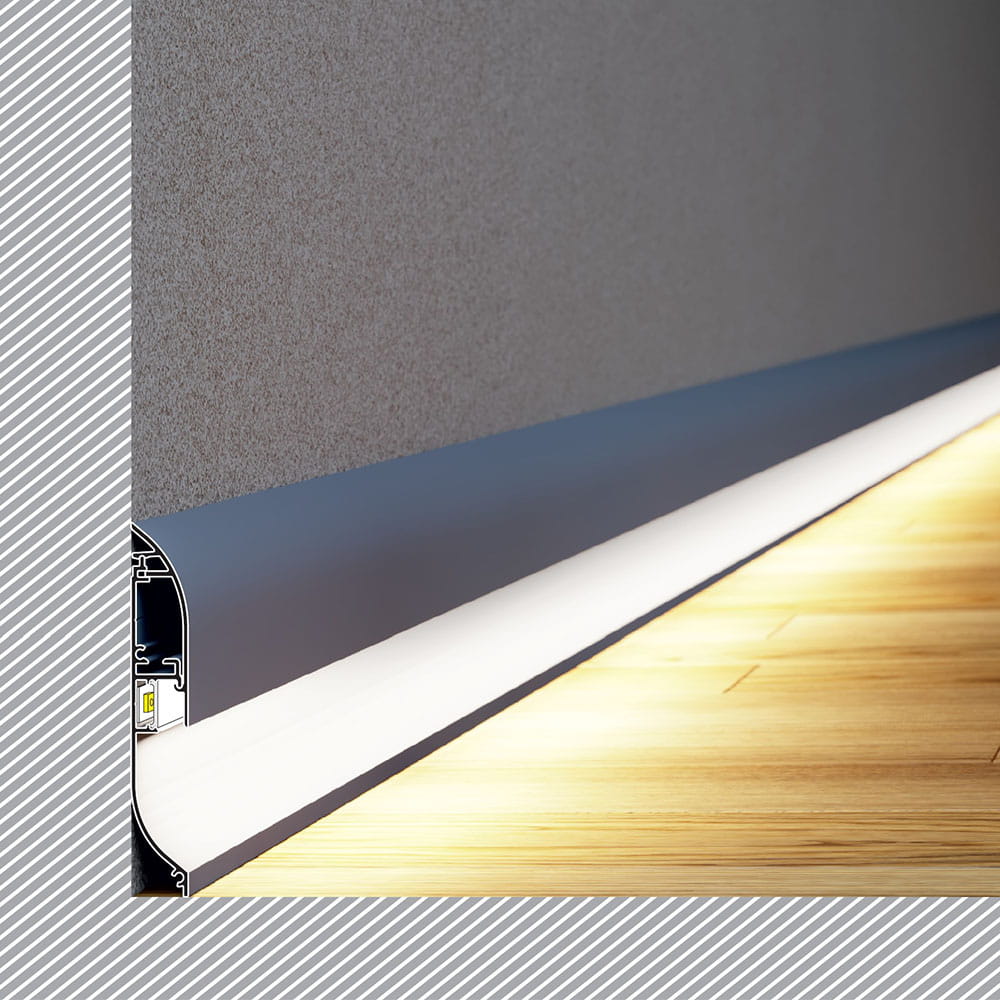 Dodatkowo do profilu przeznaczona została aluminiowa osłona (w kilku wersjach wykończenia), która pozwala na zamaskowanie górnej budowy profilu SKIRT10 oraz ukrycie przewodów, a co za tym idzie uzyskanie pełnego i estetycznego wykończenia całej konstrukcji. Posiadamy w swojej ofercie również przypodłogową listwę aluminiową BASE, która jest stylistycznym uzupełnieniem profilu przypodłogowego LED SKIRT10 - dzięki temu możesz uzupełnić miejsce na podłodze, w którym nie potrzebujesz podświetlenia a chcesz zachować ten sam wygląd instalacji.