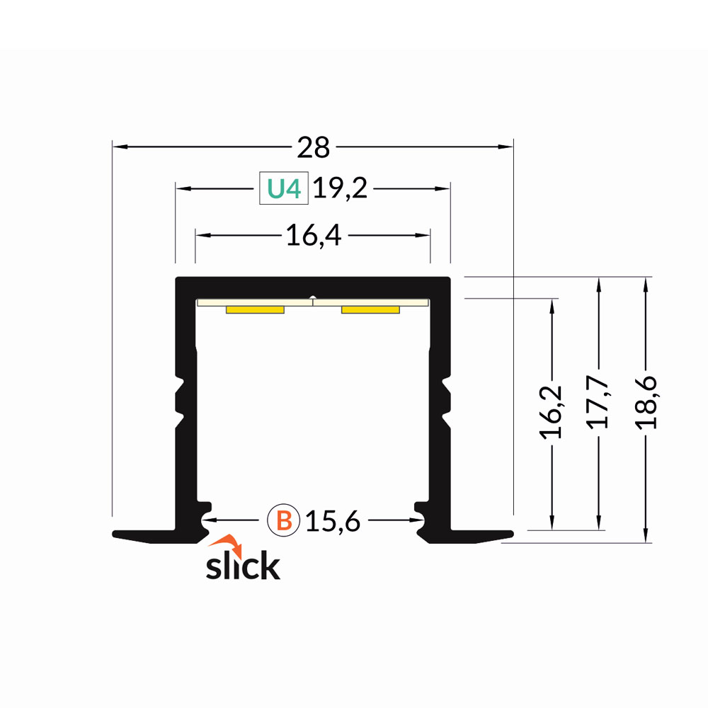 Niewątpliwą zaletą profilu LED SMART-IN16 jest fakt, iż w swej budowie posiada on gniazdo "slick", które to pozwala na łatwe "wklikiwanie" klosza wsuwanego. Takie rozwiązanie z pewnością sprawdzi się idealnie w miejscach, w których powierzchnia montażowa jest ograniczona, a co za tym idzie - wsunięcie klosza jest problematyczne.