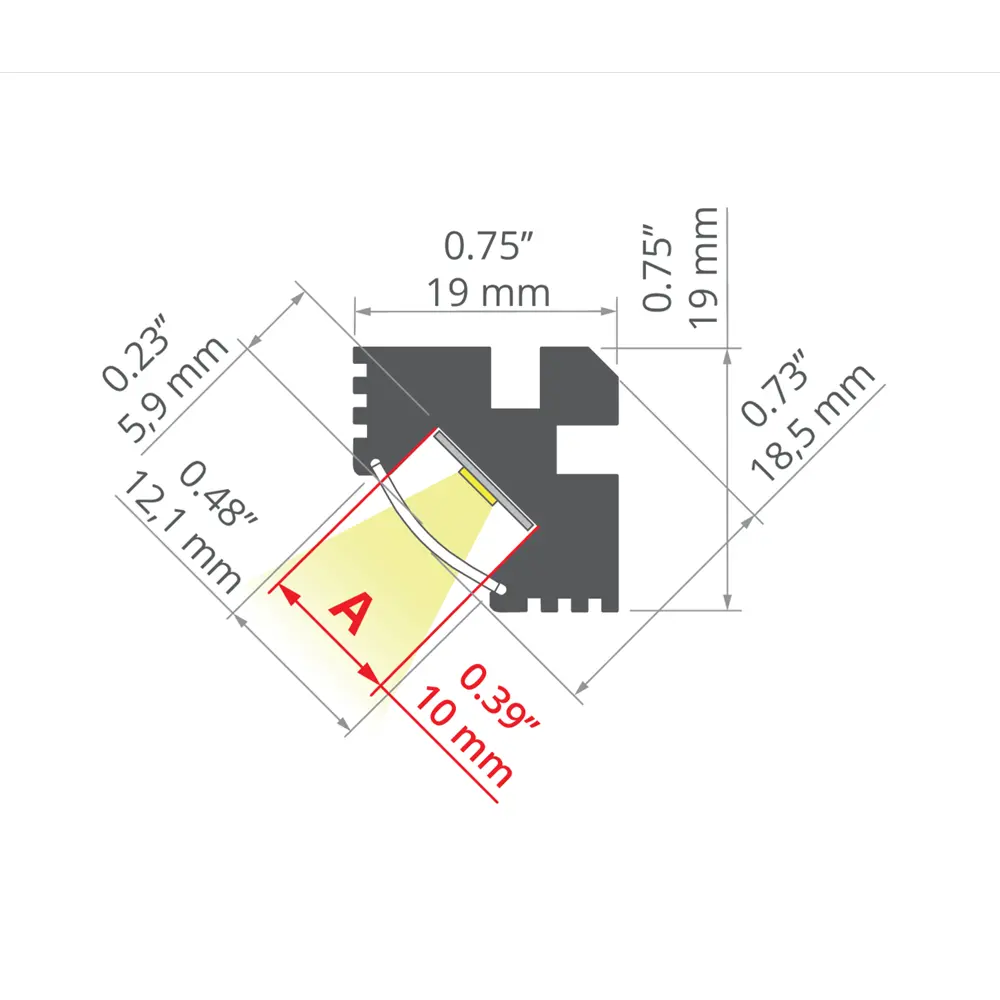 Jedną z głównych cech listwy aluminiowej TAN-C5 jest fakt, iż konstrukcja profilu pozwala uzyskać kąt świecenia 45°.