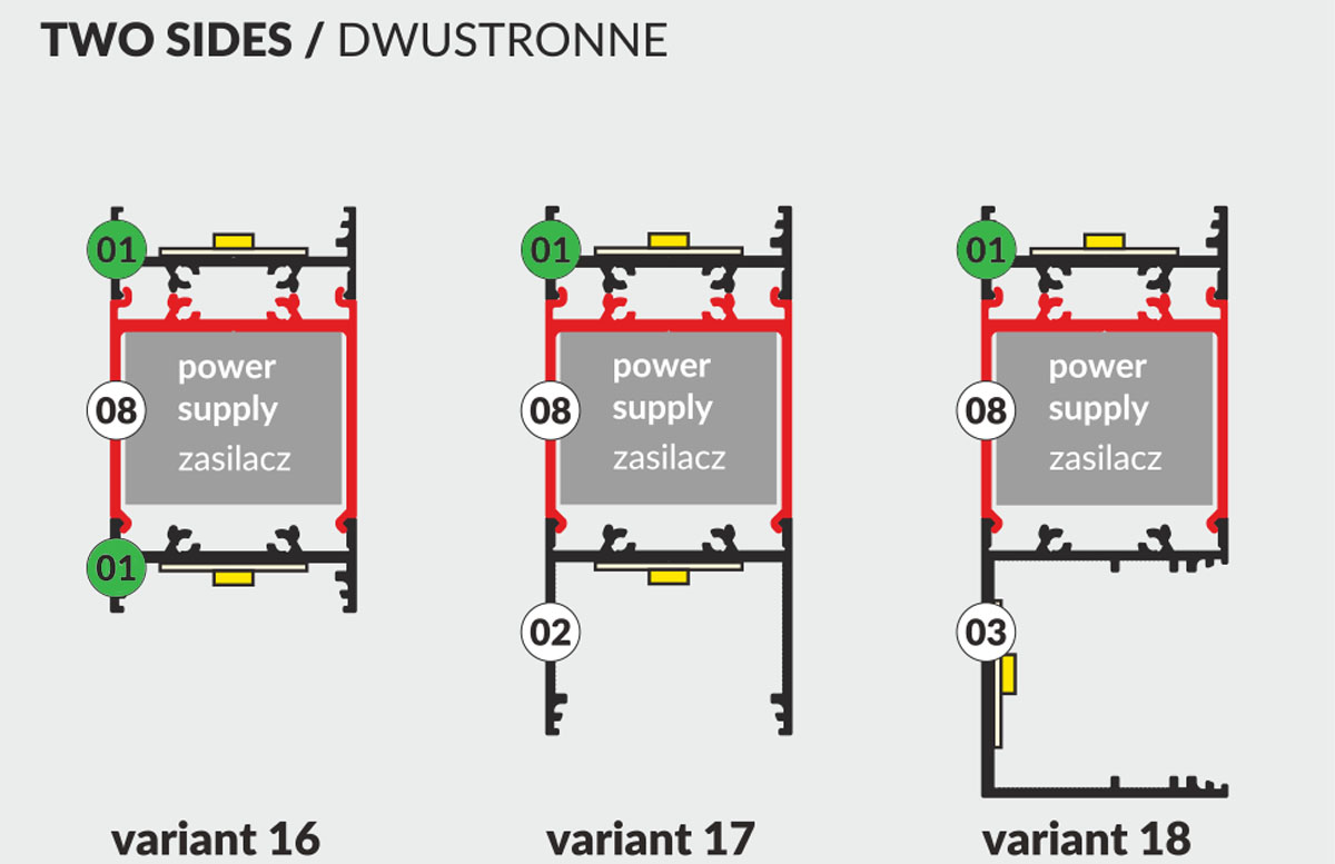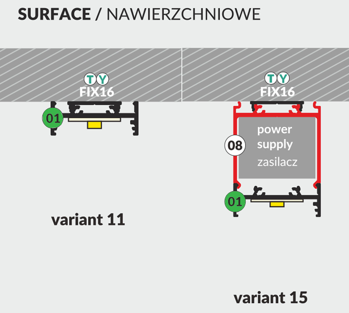 - Wariant 15: Profil aluminiowy FIX16 lub uchwyt "T" oraz obudowa do zasilacza (profil VARIO30-08)