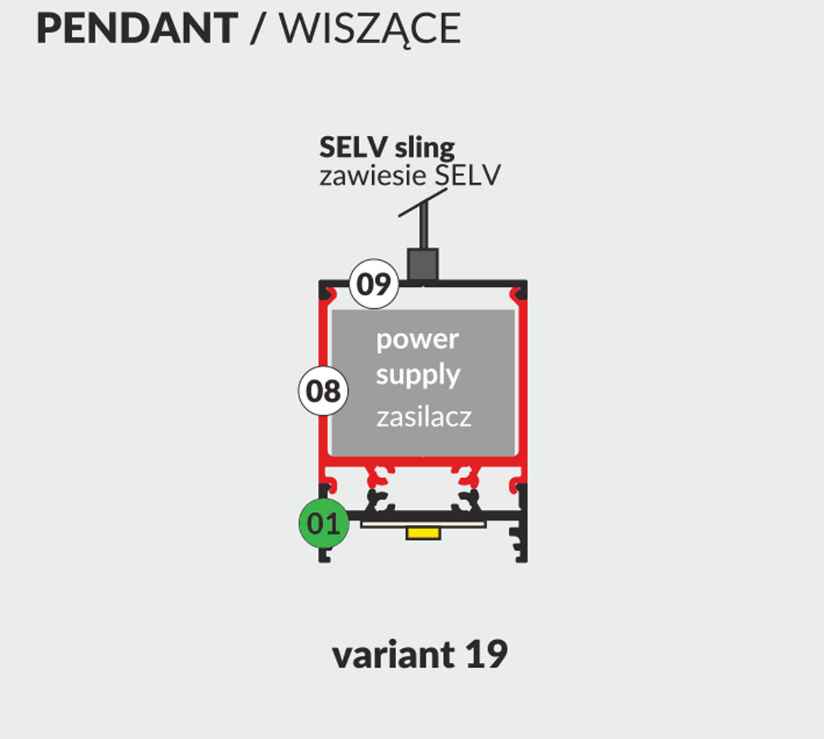 - Wariant 19: Obudowa zasilacza (VARIO30-08), Osłona VARIO30-09 oraz zawiesie SELV