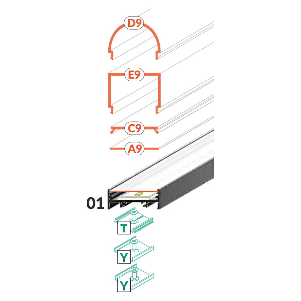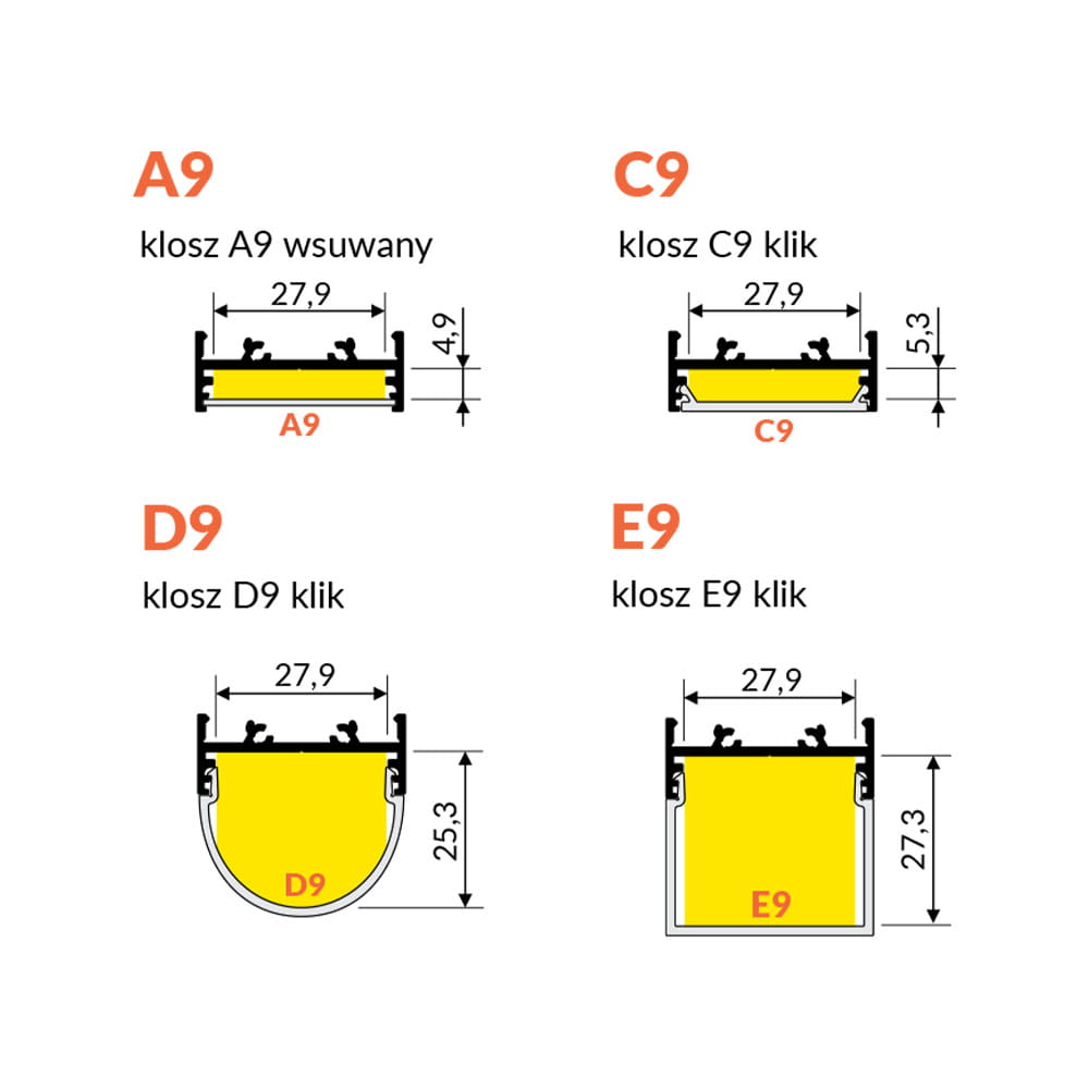 - Klosz D9 "Mleczny" - (transparentność 70%) - klosz zatrzaskowy, wciskany do profilu. Wersja mleczna klosza tworzy efekt jednolitej poświaty (niewidoczne diody taśmy LED), a także niweluje efekt olśnienia. Ogromnym atutem klosza jest jego budowa w kształcie "tunelu" - pozwalająca zwiększyć możliwości użytkowe profilu i wykorzystać go m.in. jako nowoczesną - minimalistyczną lampę.