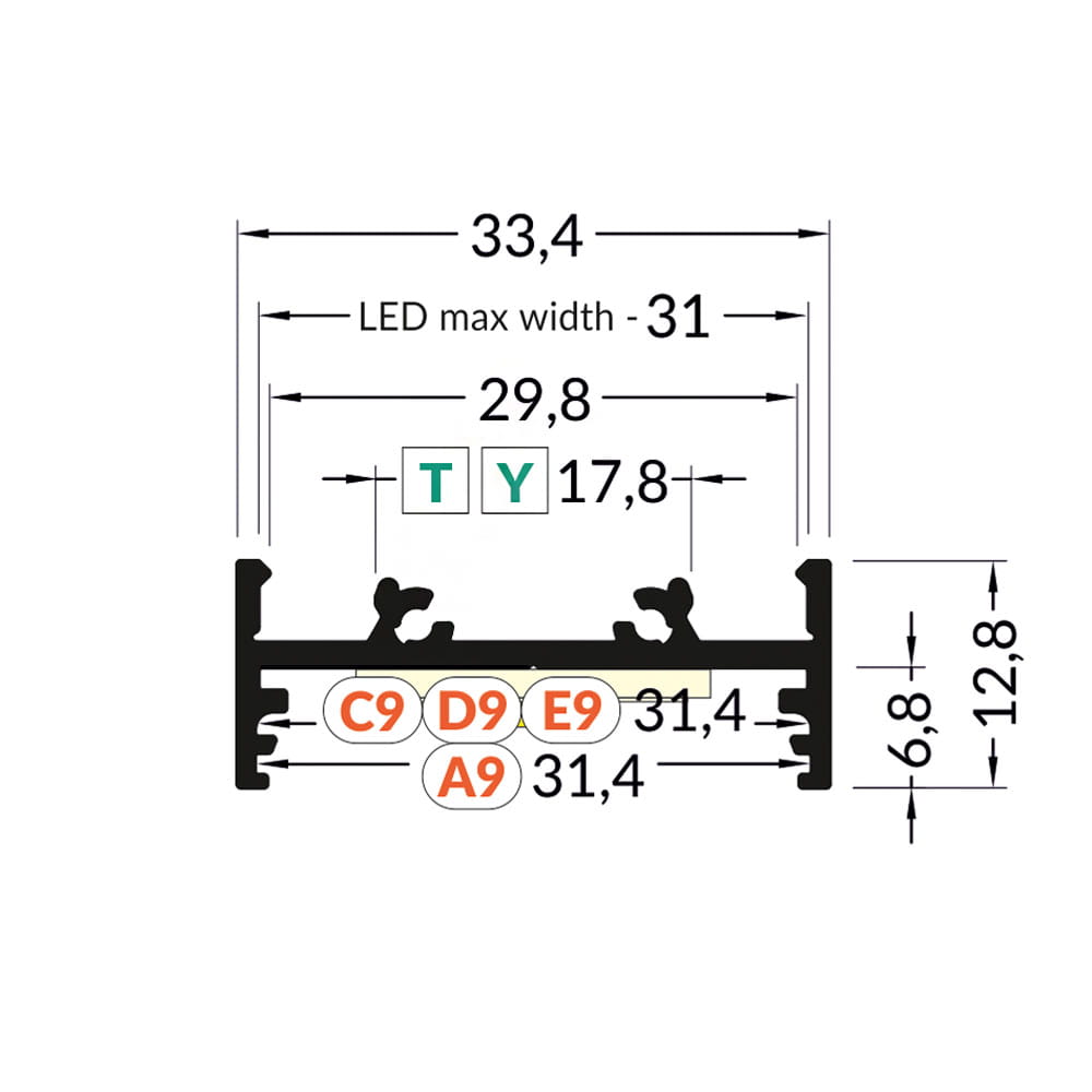 - Klosz C9 "Czarny" - (transparentność 40%) - klosz zatrzaskowy, wciskany do profilu. Czarna wersja klosza doskonale komponuje się z czarnymi profilami LED tworząc jednolitą czarną powierzchnię razem z profilem. Mimo, że jest to klosz czarny - nie zmienia on barwy światła zainstalowanego w profilu.