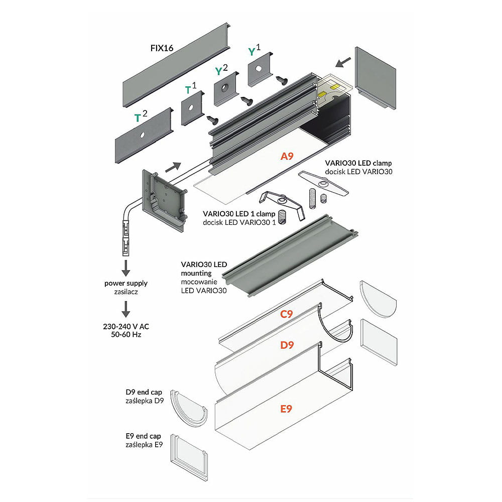 Forma profili aluminiowych LED VARIO30 została stworzona w sposób pozwalający na obszerne ich modułowe łączenie, tak aby finalny efekt spełniał oczekiwania klienta. Każdy profil LED systemu VARIO30 w swoim zasobie posiada opcje montażu zarówno w pozycji nawierzchniowej, wiszącej czy też dwustronnej, wszystko tak naprawdę zależy od potrzeby oraz dobranych kompatybilnych komponentów. Ogromnym atutem sytemu profili aluminiowych LED VARIO30 jest możliwość obudowania zasilacza, dzięki specjalnie dobranej listwie VARIO30-08 pasującej do każdego z wariantów w tej sekwencji.