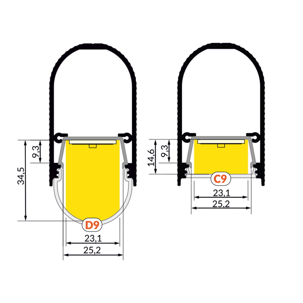 - Klosz D9 "Mleczny" - (transparentność 70%) - klosz zatrzaskowy, wciskany do profilu. Wersja mleczna klosza tworzy efekt jednolitej poświaty (niewidoczne diody taśmy LED), a także niweluje efekt olśnienia. Ogromnym autem klosza jest jego budowa w kształcie "tunelu" - pozwalająca zwiększyć możliwości użytkowe profilu i wykorzystać go mi.in. jako nowoczesną - minimalistyczną lampę.