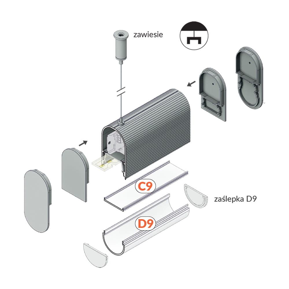 W celu uzyskania pełnej estetyki profil do taśmy LED powinien zostać zakończony zaślepkami. W razie montażu klosza "D9" zatrzaskowego wraz z zaślepką NAMI23, zalecamy użycie dodatkowej kompatybilnej zaślepki "D9" mlecznej, dzięki której zakończenia profilu również będą świecić.