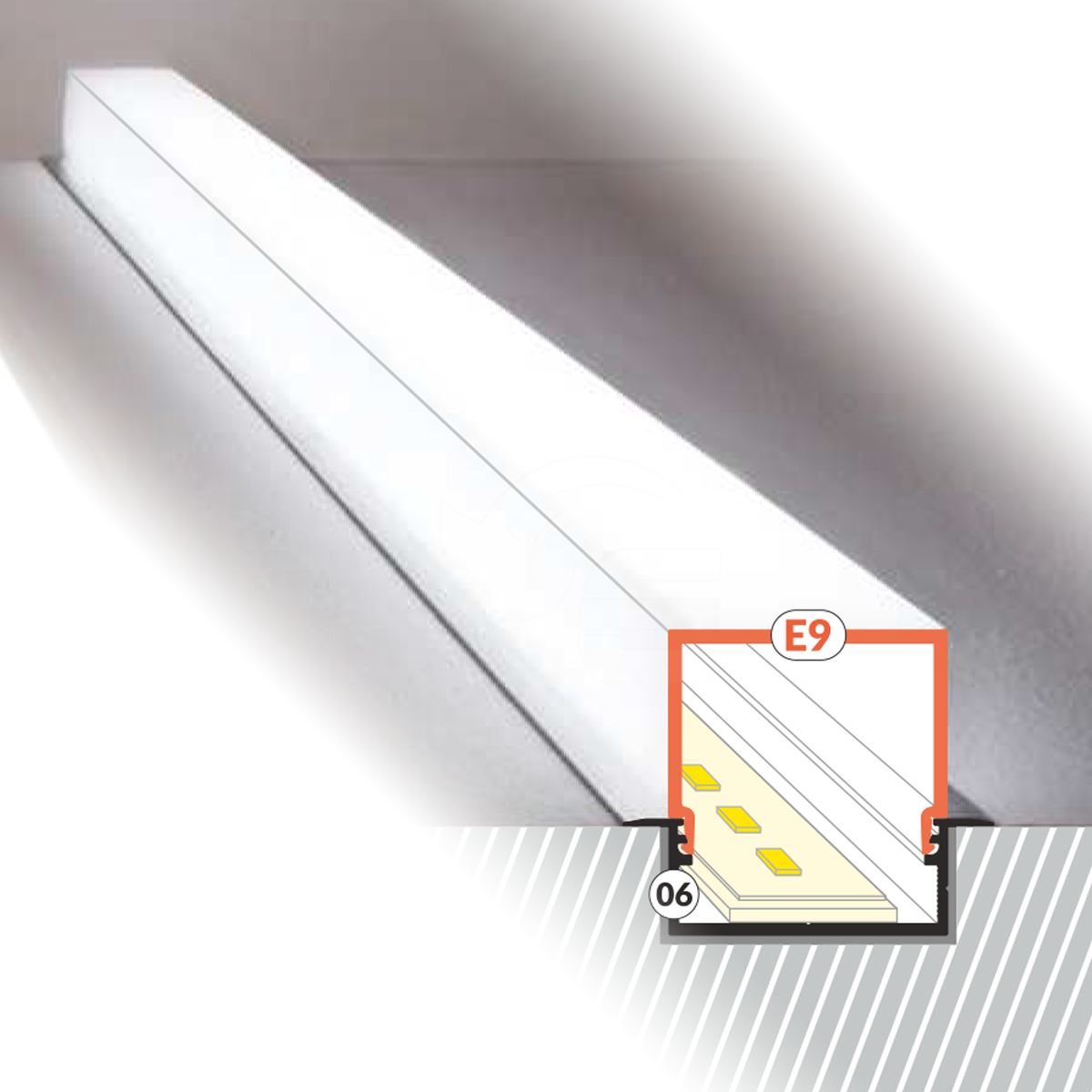 - Klosz E9 "Mleczny" - (transparentność 70%) - klosz zatrzaskowy, wciskany do profilu. Wersja mleczna klosza tworzy efekt jednolitej poświaty (niewidoczne diody taśmy LED), a także niweluje efekt olśnienia. Ogromnym atutem klosza jest jego budowa w kształcie "tunelu" - pozwalająca zwiększyć możliwości użytkowe profilu i wykorzystać go m.in. jako nowoczesną - minimalistyczną lampę.