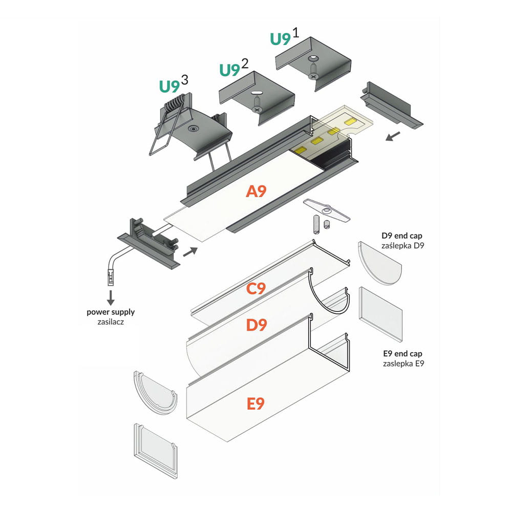 - Klosz C9 "Mleczny" - (transparentność 70%) - klosz zatrzaskowy, wciskany do profilu. Wersja mleczna klosza tworzy efekt jednolitej poświaty (w głębszych profilach jednolitej linii) a także niweluje efekt olśnienia.