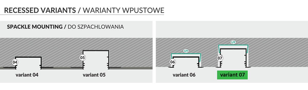 Odpowiedni rozmiar profilu oraz prosta forma znacznie poszerza możliwości użytkowe i wzornicze. Listwa LED VARIO30-07 może zostać zamontowana za pomocą dedykowanych uchwytów sprężystych "U9" (o dwóch sposobnościach montażu - z dystansem do powierzchni montażowej lub bez) oraz uchwytu "U9" sprężyny, który ułatwi mocowanie profilu w płytach gipsowo-kartonowych ale również w ścianach murowanych oraz meblach. VARIO30-07 może zostać również zamontowany za pomocą wkrętów lub kleju montażowego. Listwa aluminiowa LED wpustowa VARIO30-07 zasługuje na szczególną uwagę, dzięki dostępności w swej ofercie sporego zasobu dostępnych łączników kątowych (pięć różnych kątów 60°/90°/120°/135°/180°/270°), pozwalając tym samym na tworzenie wielu różnych układów oświetlenia bez konieczności cięcia profilu pod skosem. Ważnym elementem systemowych profili aluminiowych LED są kompatybilne klosze, to tak naprawdę jeden z ważniejszych elementów estetyki całej oprawy, dzięki szerokiej gamie dostępności i różnorodności nie tylko w zakresie transparentności, ale także budowy, klient posiada możliwość stworzenia niezwykle ciekawych aranżacji. W celu uzyskania pełnej estetyki profil do taśmy LED powinien zostać zakończony zaślepkami.