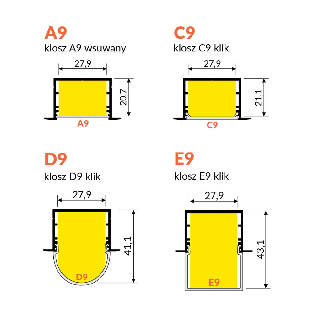 - Klosz C9 "Transparentny" - (transparentność 95%) - klosz zatrzaskowy, wciskany do profilu. Wersja klosza transparentna inaczej "przezroczysta", ma za zadanie przepuścić jak największą część emitowanego światła przez taśmę LED.
