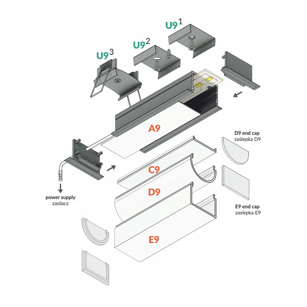 - Klosz C9 "Mleczny" - (transparentność 70%) - klosz zatrzaskowy, wciskany do profilu. Wersja mleczna klosza tworzy efekt jednolitej poświaty (w głębszych profilach jednolitej linii) a także niweluje efekt olśnienia.